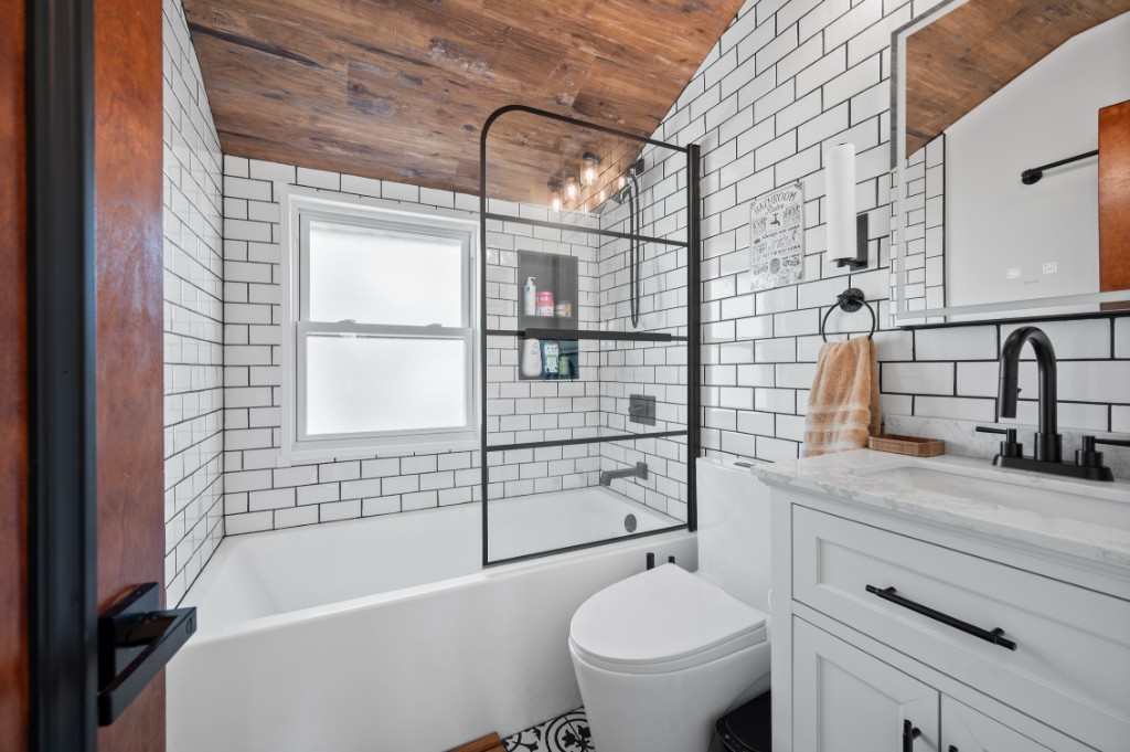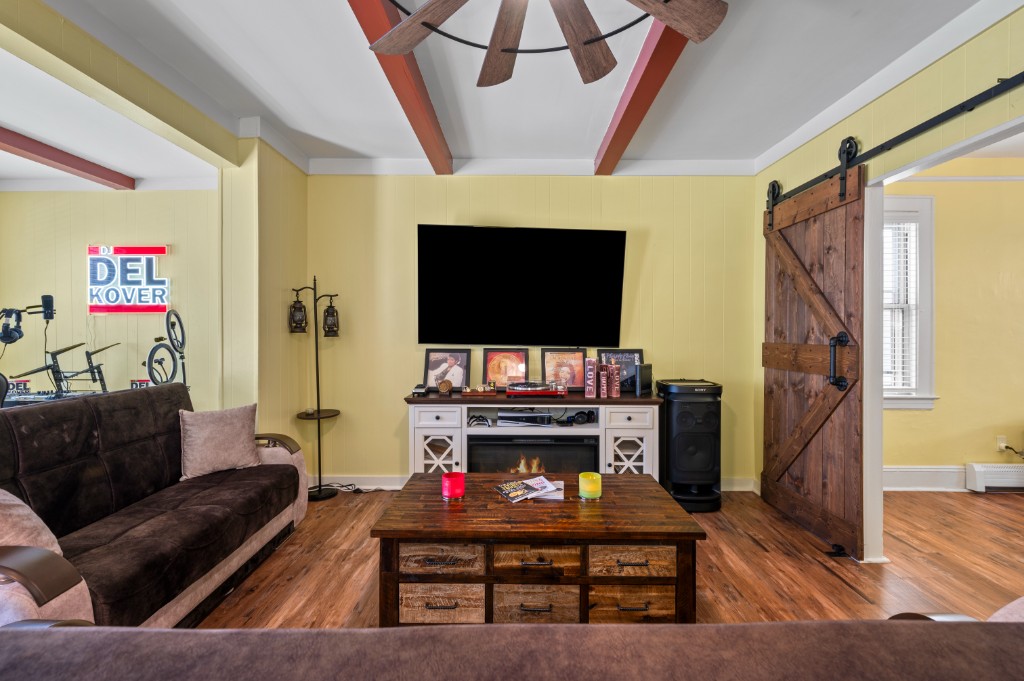 The main level offers a comfortable living and dining flow with attractive flooring, beamed ceilings, and a bright inviting feel. The updated kitchen features modern cabinetry, updated counters, stainless steel appliances, and a clean functional layout. The full bathroom has been tastefully renovated, and the home shows with a move-in-ready feel throughout.