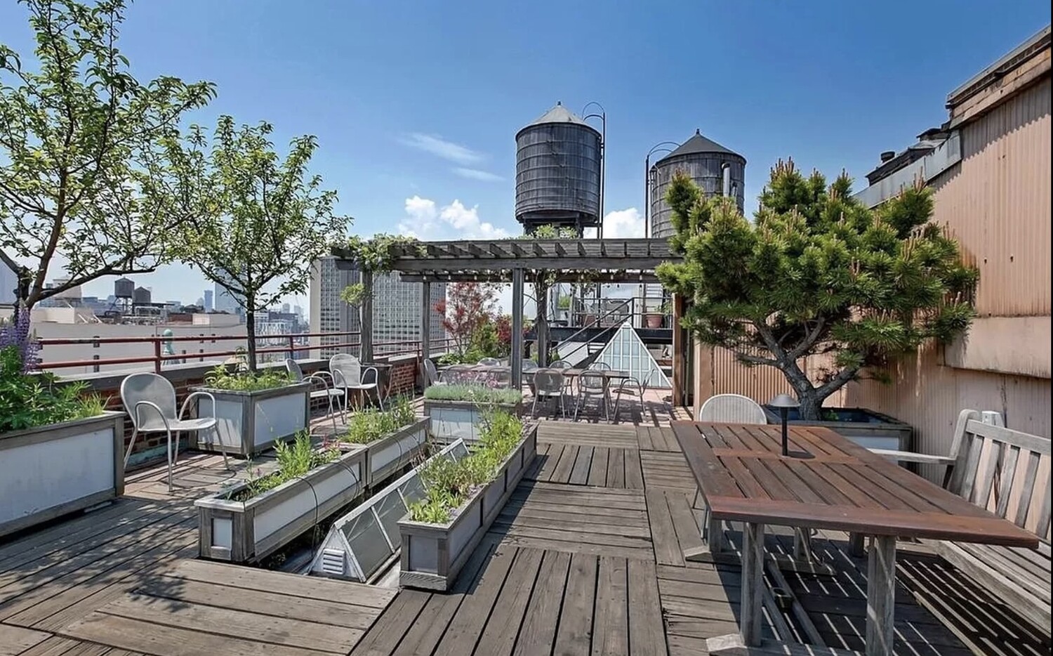 The building has a private landscaped roof deck offering an idyllic retreat with sweeping city views, a dining area, seating, and new barbecue.