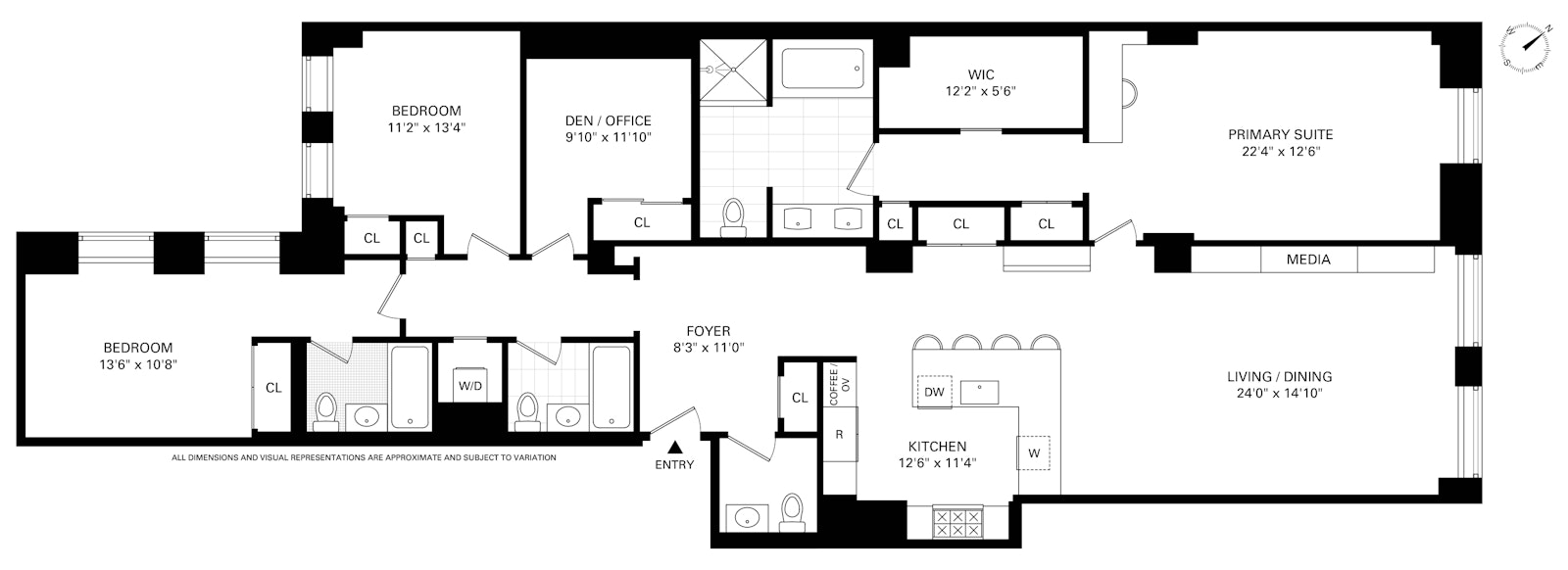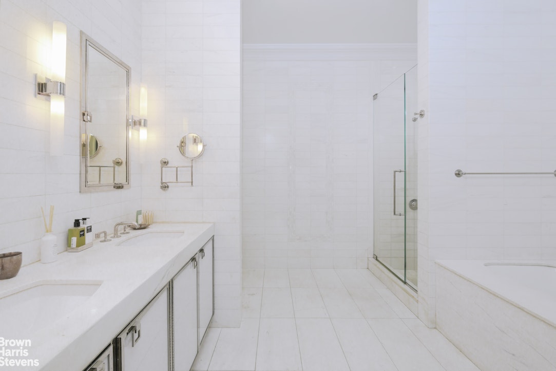 This luxurious apartment features two more generous bedrooms, one with an ensuite bath, and the other with a hall bath for ultimate flexibility. There is also a den/office that currently serves as a playroom. A powder room with a marble vanity is located off the foyer. 11F has a Bosch washer/dryer that vents out, Fios Hi-Speed internet and full CAT 5E wiring for phone & cable.