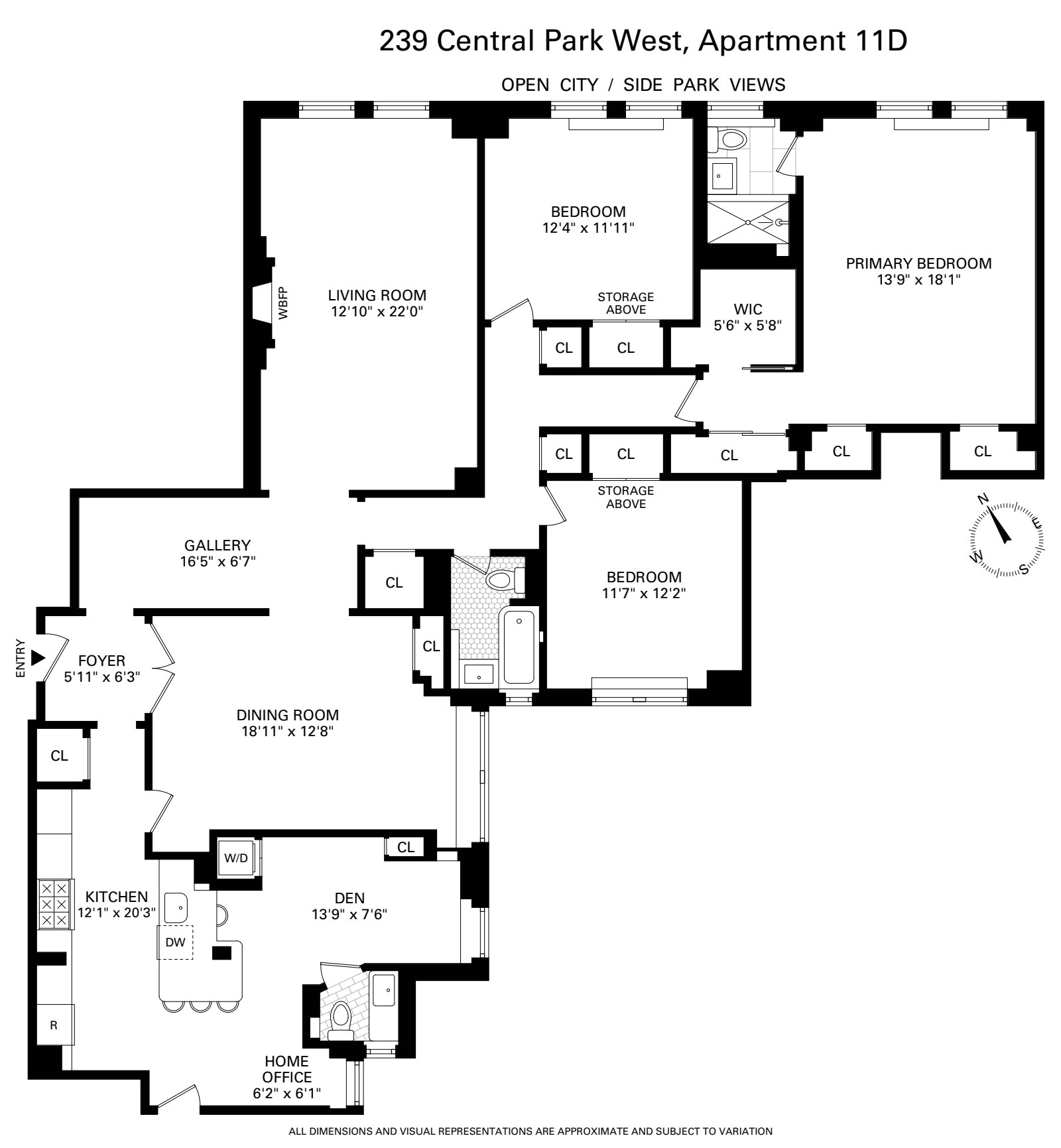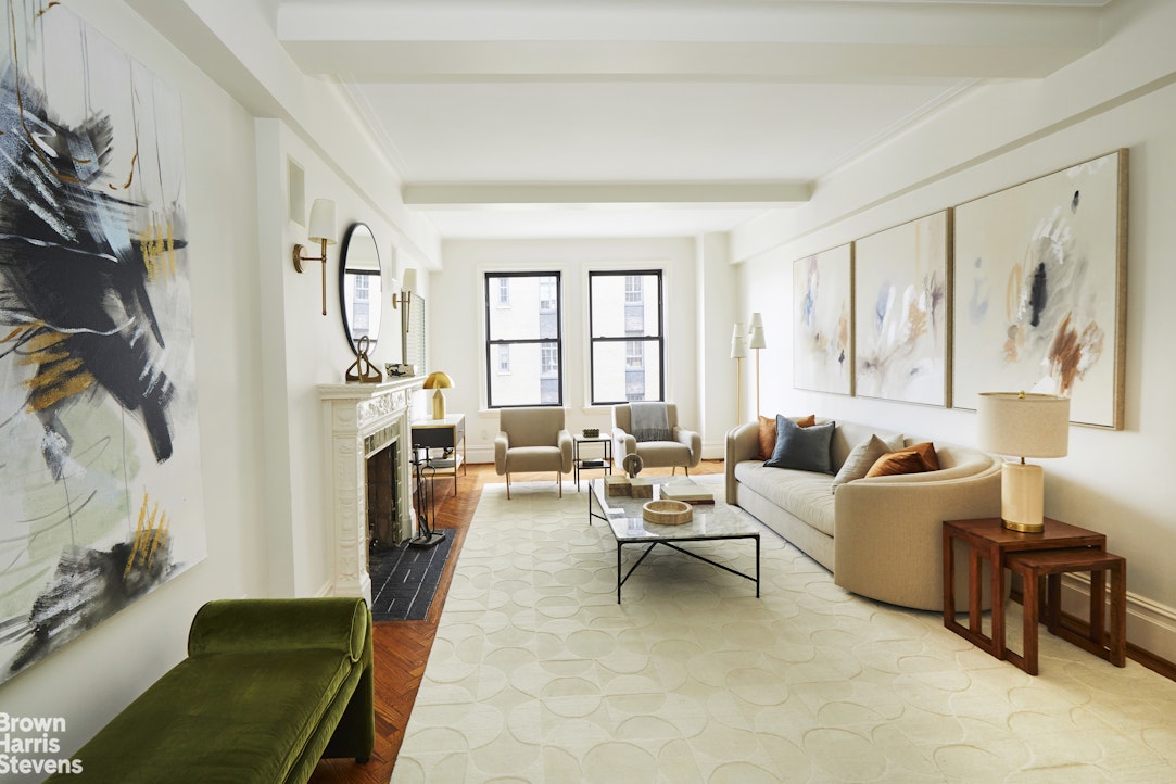 The residence opens into a grand central gallery, establishing a sense of scale. A 40-foot expanse connects the formal dining room through the gallery and living room, featuring a wood-burning fireplace. All three bedrooms are generously proportioned, with the primary bedroom offering en-suite privacy, a customized walk-in closet and beautiful side views of Central Park.
