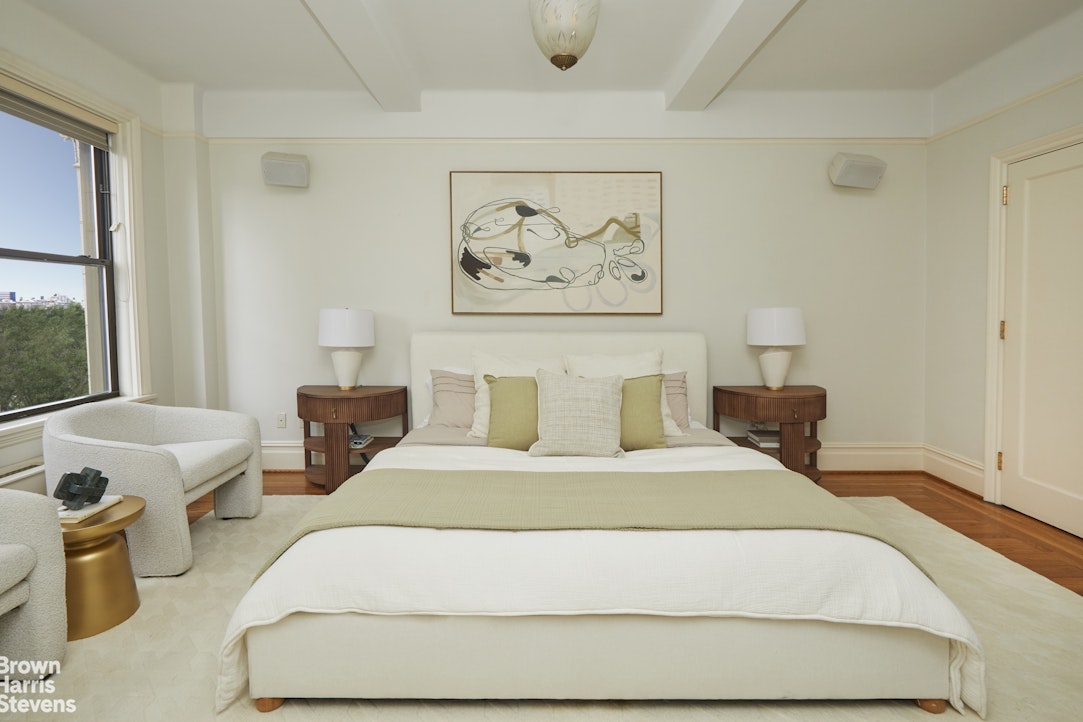 This 3-bedroom, 2.5-bath home flows naturally between your living, entertaining, and private wings, anchored by a central gallery. Elevated by high-beamed ceilings and inlaid basket-weave floors, the sunny space offers captivating side views of Central Park and open city vistas from the living room and bedrooms - a daily reminder of your prestigious Central Park West address in a premier full-service, white-glove cooperative.