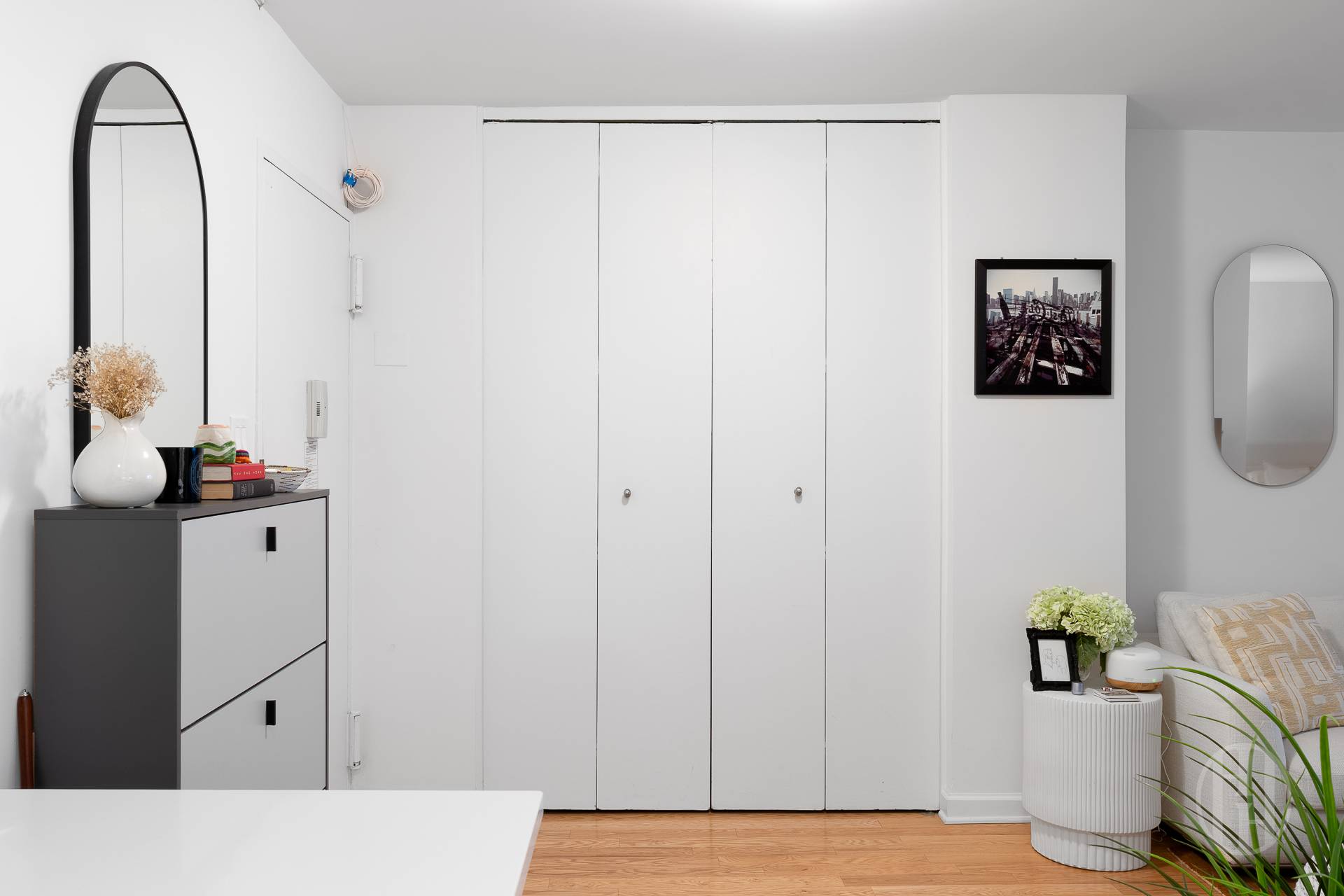 Welcome to Residence 11L at The Churchill, a beautifully renovated alcove studio that blends modern design with effortless comfort. Bright and sunny, this inviting home offers a gracious, thoughtful layout for distinct living, dining, and sleeping. The gallery foyer leads into a modern open-concept kitchen designed for the culinary enthusiast, featuring pristine white cabinetry, sleek Italian tile backsplash, elegant chocolate brown tile flooring, and high-end stainless steel appliances. The breakfast bar and extended countertop provide the perfect perch for morning coffee or casual entertaining, seamlessly connecting the kitchen to the main living area, which allows for versatile living and dining layouts. The oversized alcove—which accommodates a queen-sized bed, dresser and sitting area—offers distinct separation from the living room and can easily be partitioned with custom sliding doors or a decorative screen to create a true private bedroom feel, remaining bright and airy while providing a quiet, dedicated sanctuary for rest. The bathroom has been meticulously reimagined, featuring a sophisticated palette of porcelain tiling that stretches from floor to ceiling. A custom-integrated vanity offers exceptional storage, topped with a contemporary basin and polished chrome fixtures. The space is anchored by a deep soaking tub and a sleek mirrored medicine cabinet, providing a sleek spa-like atmosphere that perfectly complements the home’s comfortable yet luxe living experience. The home features a seamless flow of beautiful hardwood flooring and fantastic closet space that is a rarity for Manhattan alcove studio. Multiple integrated closets strategically maximize the open-concept feel while providing hidden storage for a streamlined, clutter-free lifestyle. The Churchill is a premiere full-service condop with an array of luxury amenities. Enjoy iconic city views while lounging or swimming at the outdoor rooftop pool club, adjacent to two landscaped furnished roof decks. State-of-the-art gym and weight room, sauna, newly renovated residents' lounge with WiFi, TV, library, kitchen and floor-to-ceiling views of the East River. The onsite valet offers home cleaning services, dry cleaning and laundry, package services and so much more. A landscaped garden surrounds the building and its porte cochere driveway. Superbly attentive and friendly building staff complete this truly exceptional living experience. The Churchill adheres to condo-like rules re: board approval and allows subletting, investors, co-purchasing, pied-à-terres, and parents buying for children. Pets welcome.