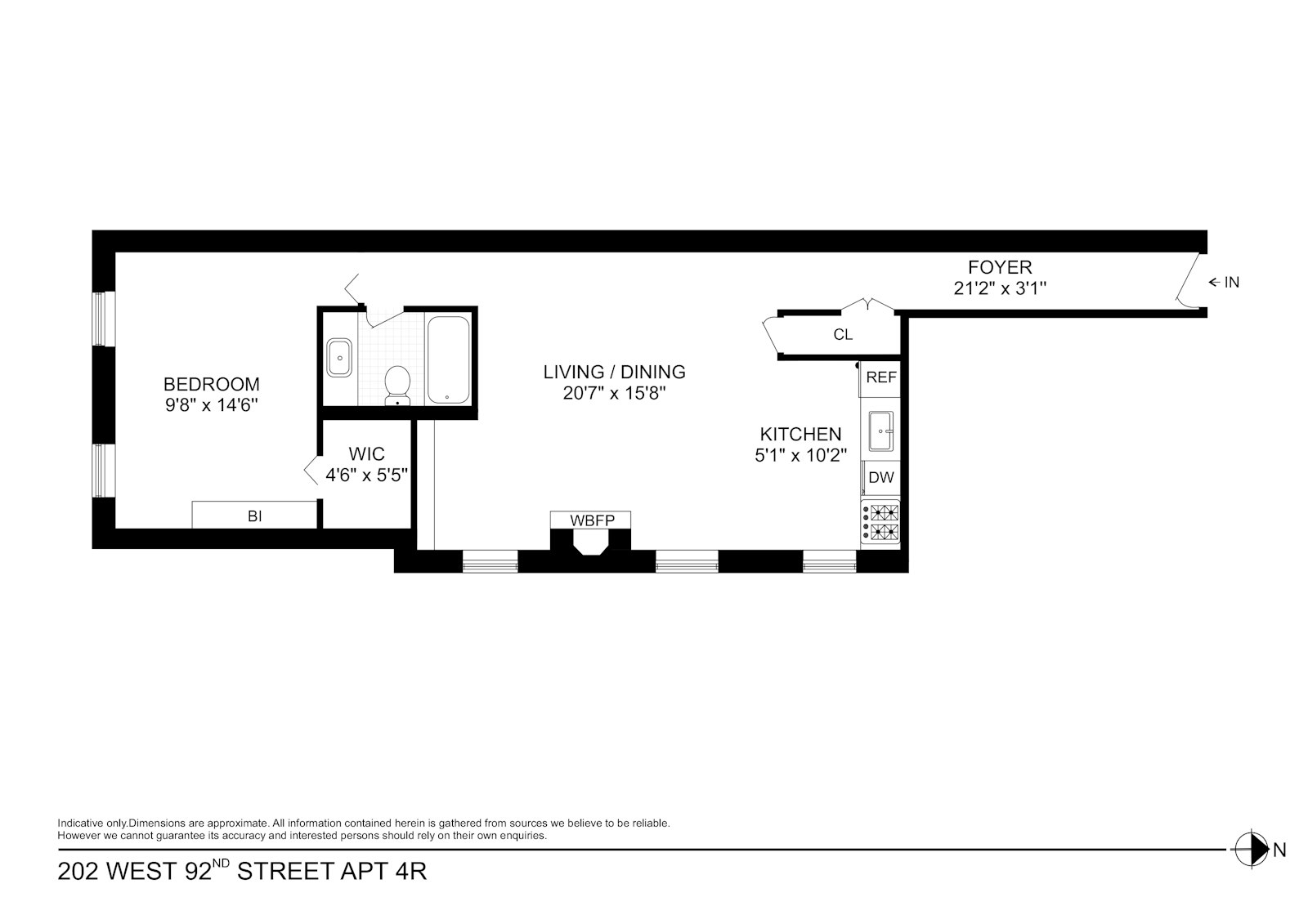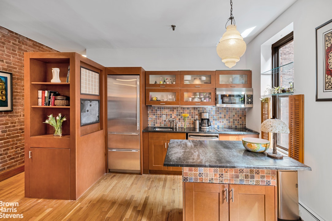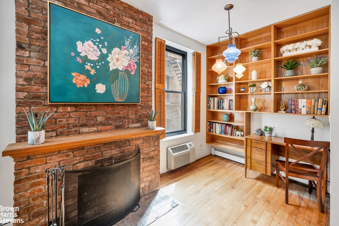 Welcome to apartment 4R, a beautifully renovated one bedroom loaded with pre-war charm. With soaring 9'2" ceilings and oak wood floors, the space feels open and airy. A wood burning fireplace provides a cozy focal point in the living room. Lovely brick walls in both the living room and bedroom, add character and warmth throughout.