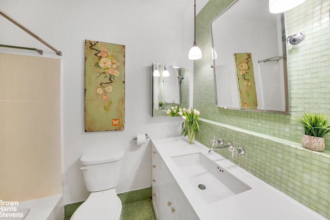 The south facing bedroom is pin drop quiet and has a large walk-in closet with generous storage and organization options. The renovated bathroom has custom tile work and an extra-large vanity and sink. All of the windows have recently been replaced.