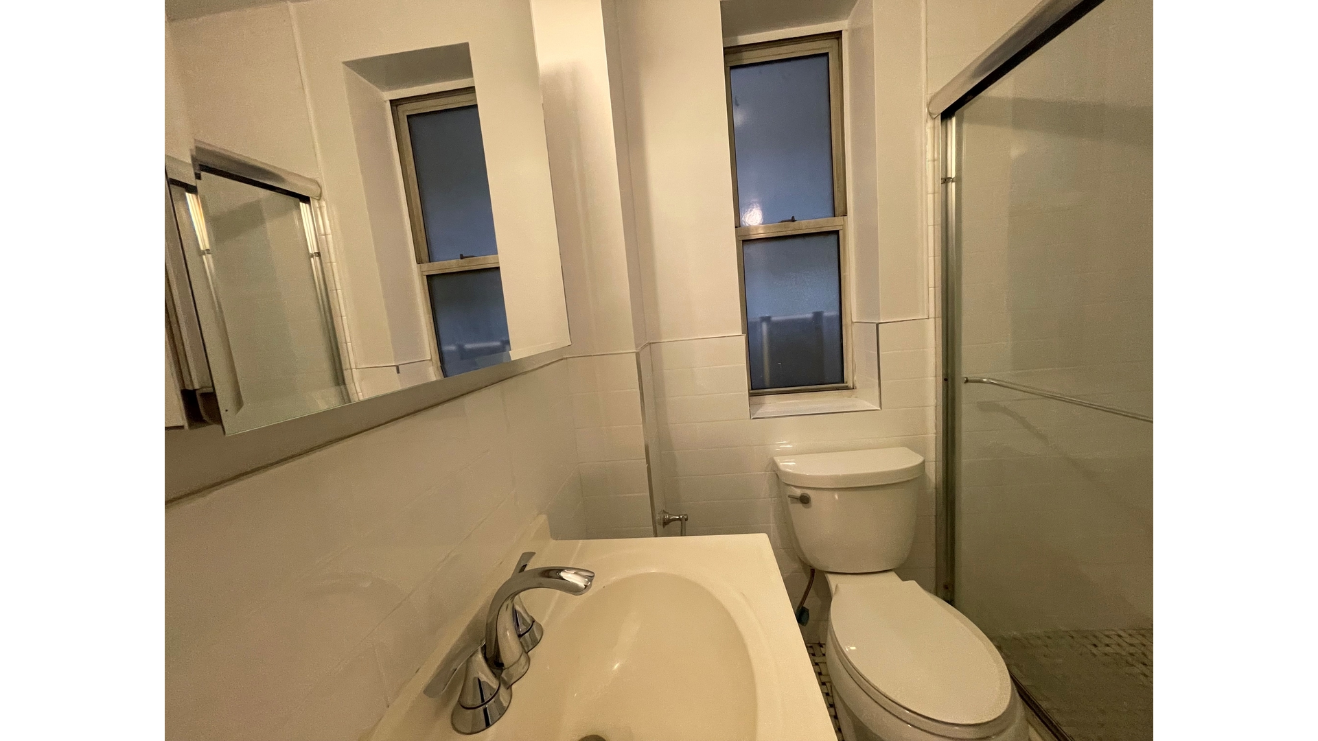 The bathroom has been tastefully renovated with classic white subway tile and a stall shower, offering a clean and contemporary feel.