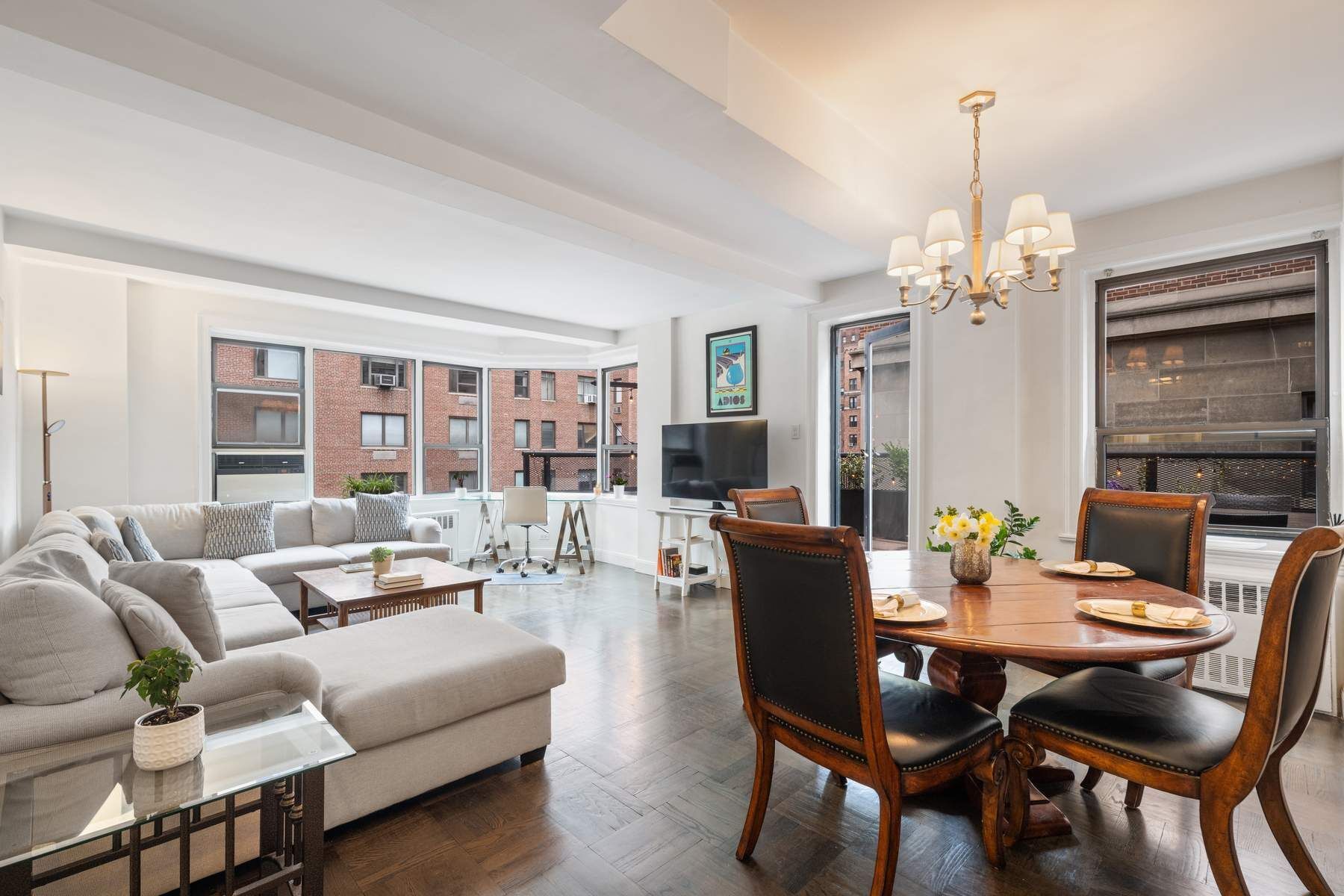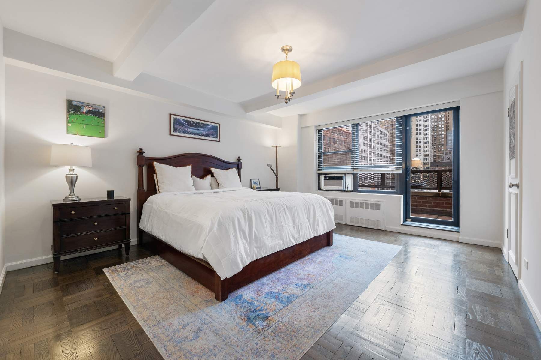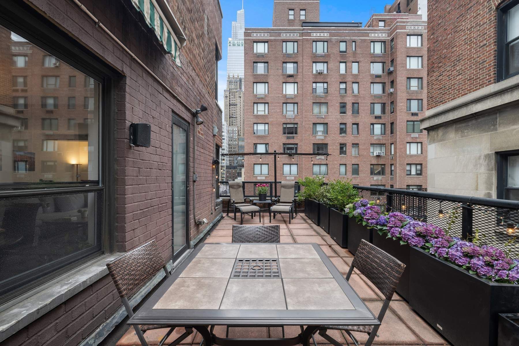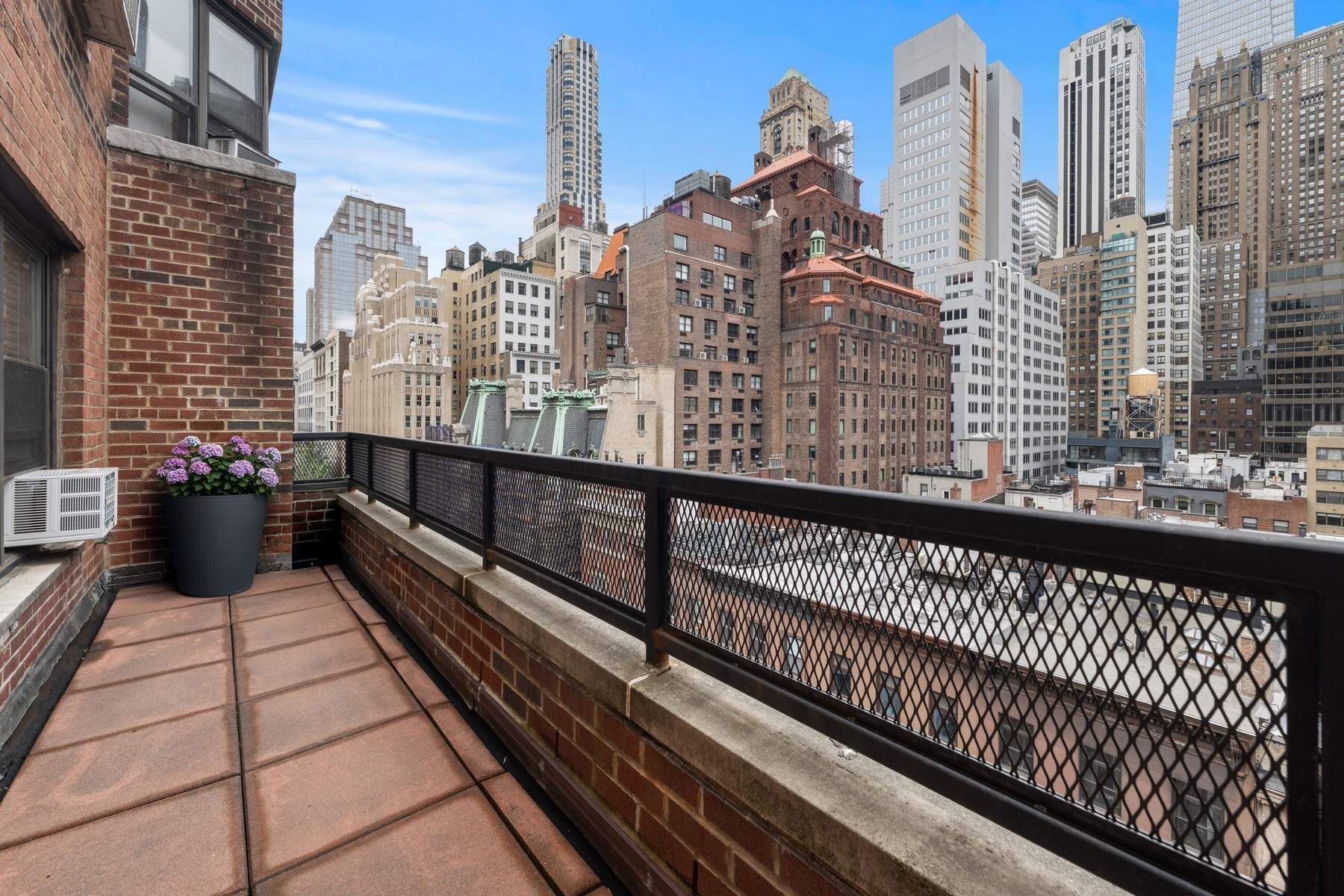 Perfectly positioned between Madison and Park Avenues, and nestled between the Morgan Library and the Union League Club, this standout residence pairs modern interiors with two rare private setback terraces that define this spacious home. The larger terrace is a true outdoor living room—generously sized and beautifully planted with eight containers, ideal for entertaining or relaxing under open sky. A second, more intimate terrace off the primary bedroom offers a quiet, private retreat. Facing North and East, the expansive, bright living room features multiple windows and a dining area with chandelier. The windowed kitchen is well-appointed with granite countertops and top line stainless-steel appliances including a new LG gas cooktop and electric oven, Sub-Zero refrigerator, GE Microwave and Bosch dishwasher. There is also a stainless-steel sink with a new faucet and Bosch Washer/Dryer. Two large bedrooms offer abundant storage, including a huge custom, California Closets, walk-in, in the primary. Two updated baths, new moldings, satin nickel hardware, and updated lighting complete the home. This exceptional residence offers unparalleled convenience—just moments from Grand Central Station and Bryant Park. The Morgan Park Condominium, a distinguished 13-story Emory Roth building with 104 residences, provides a full-time doorman along with new key fob and surveillance camera system. There is a laundry room, and private storage for a small monthly rate of $95 per month based on availability. The building is pet-friendly and permits co-purchasing, pied-à-terres and rentals. Residents also benefit from two elevators and recently refreshed staircases and hallways.