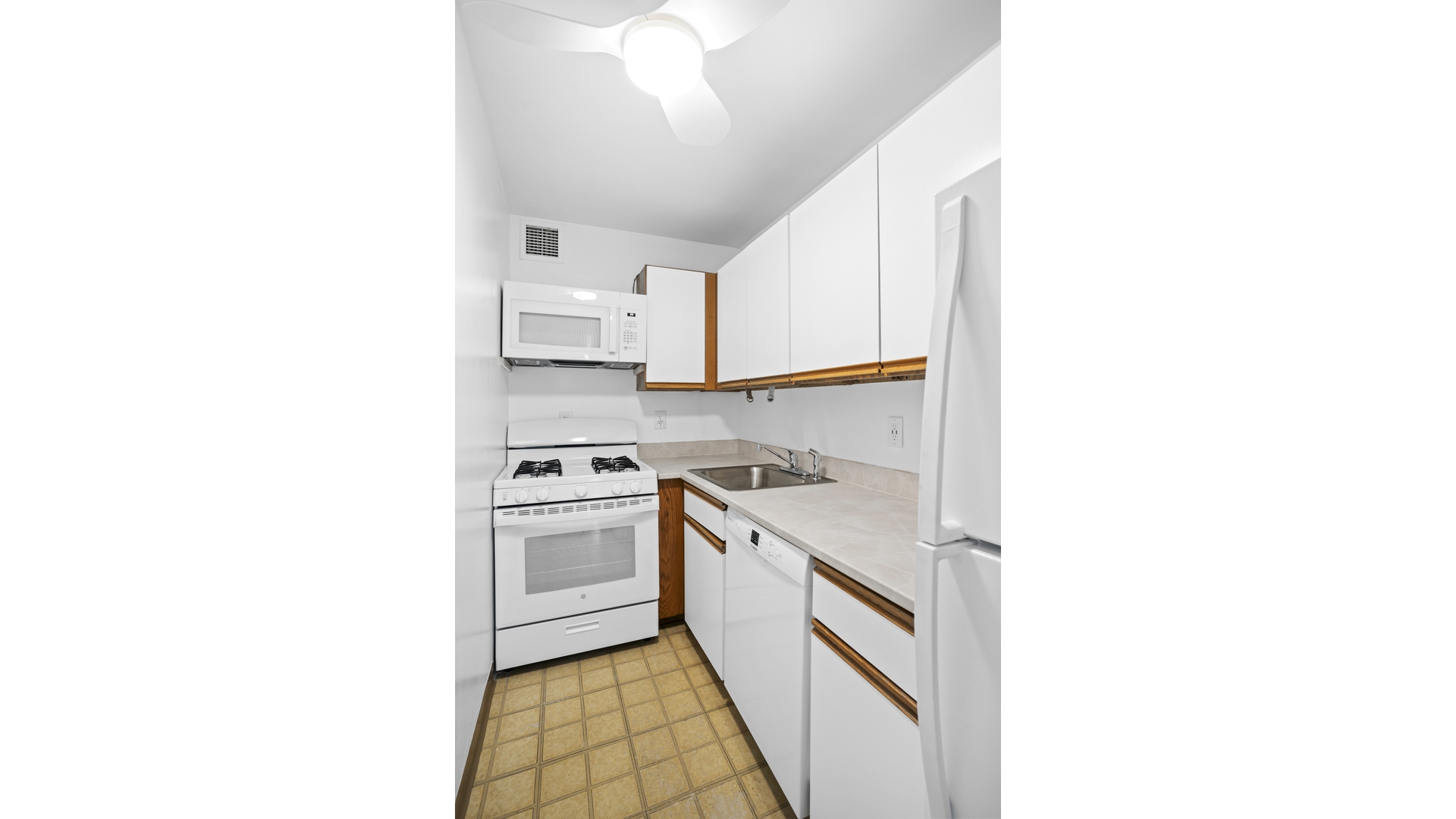 The thoughtfully designed, windowed kitchen is well-appointed with a full-size oven and four-burner gas cooktop, GE microwave, Bosch dishwasher, and Whirlpool refrigerator/freezer. Abundant cabinetry and expansive counter space offer both practicality and ease for everyday living and entertaining. Just beyond, the bathroom features a large vanity with ample storage and a deep soaking tub for a spa-like retreat.