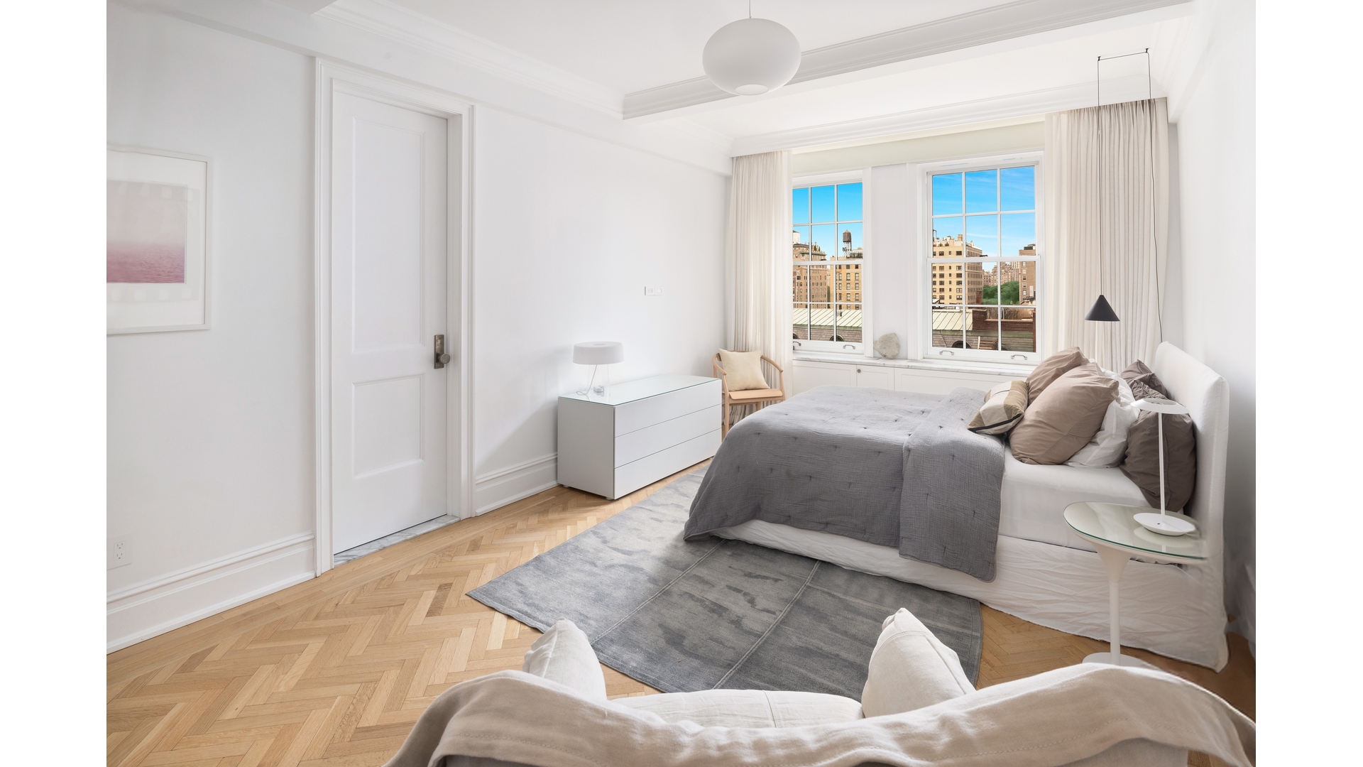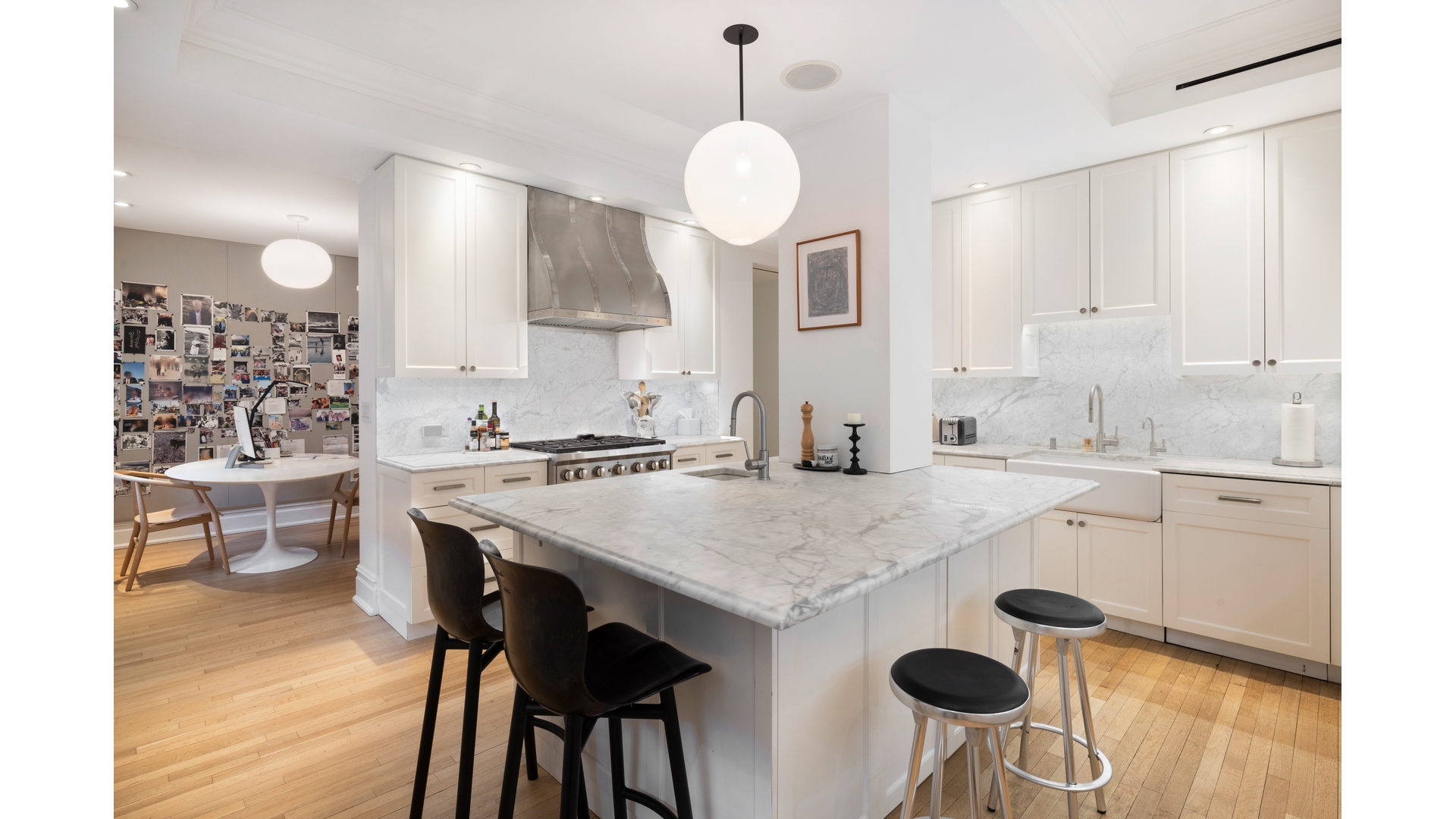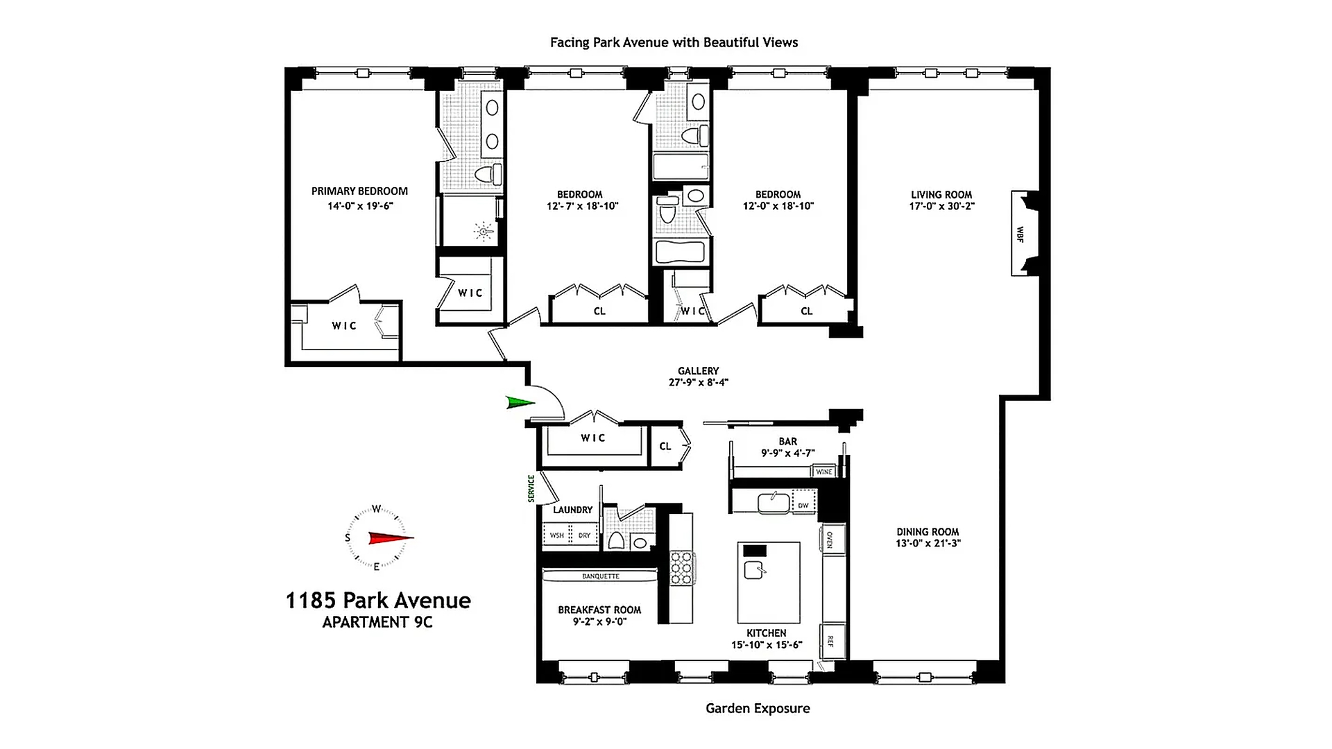 Welcome to residence 9C at 1185 Park Avenue, a reimagined classic eight that balances prewar grandeur and chic modern living. This gracious sun filled home with beautiful views has been thoughtfully renovated with impeccable craftsmanship, and high-end finishes. Positioned on a high floor with rooms facing West over Park Avenue, 9C is bathed in natural light from the large windows that offer open views of the city skyline and treetops of Central Park. Entering the dramatic 28-foot gallery, you are immediately wowed by this home's grand scale. The spectacular open living and dining room seamlessly open into an airy, loft-like space ideal for entertaining. The living room features a wood-burning marble fireplace and expansive windows overlooking Park Avenue, ensuring brilliant light all day. The dining room faces the building's beautifully landscaped central garden, offering a serene backdrop for gatherings or quiet time at home. The large west-facing primary suite is a sanctuary of comfortable sophistication, featuring two large walk-in closets and a marble bathroom. There are two additional oversized bedrooms, each with generous closet space and en-suite marble bathrooms that reflect the home's stylish aesthetic The windowed chef's kitchen is designed with thick marble countertops, custom cabinetry and top-of-the-line Rocky Mountain hardware. An adjoining butler's pantry offers flexible space and storage, while a breakfast room with garden views creates a casual, sunlit area for dining. There is a dedicated laundry room fitted with a full size, vented washer and dryer. There is also a stylish powder room, and additional storage. Featuring gorgeous herringbone floors, soaring ceilings and Central Air conditioning with multiple zones, 9C is an extraordinary home.1185 Park was designed by the renowned architects, Schwartz and Gross, in 1929. The building's striking Gothic triple arch entrance and rare Port -Cochere create a dramatic first impression leading into the meticulously landscaped garden. In addition to the full-time building staff, amenities include an upscale gym, roof garden, children's playroom and private storage. There is a 2% flip tax paid by purchaser. The building is situated moments away from Central Park, museums and some of NYC's best restaurants and shopping.