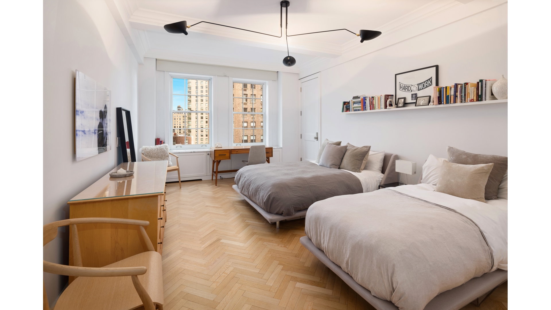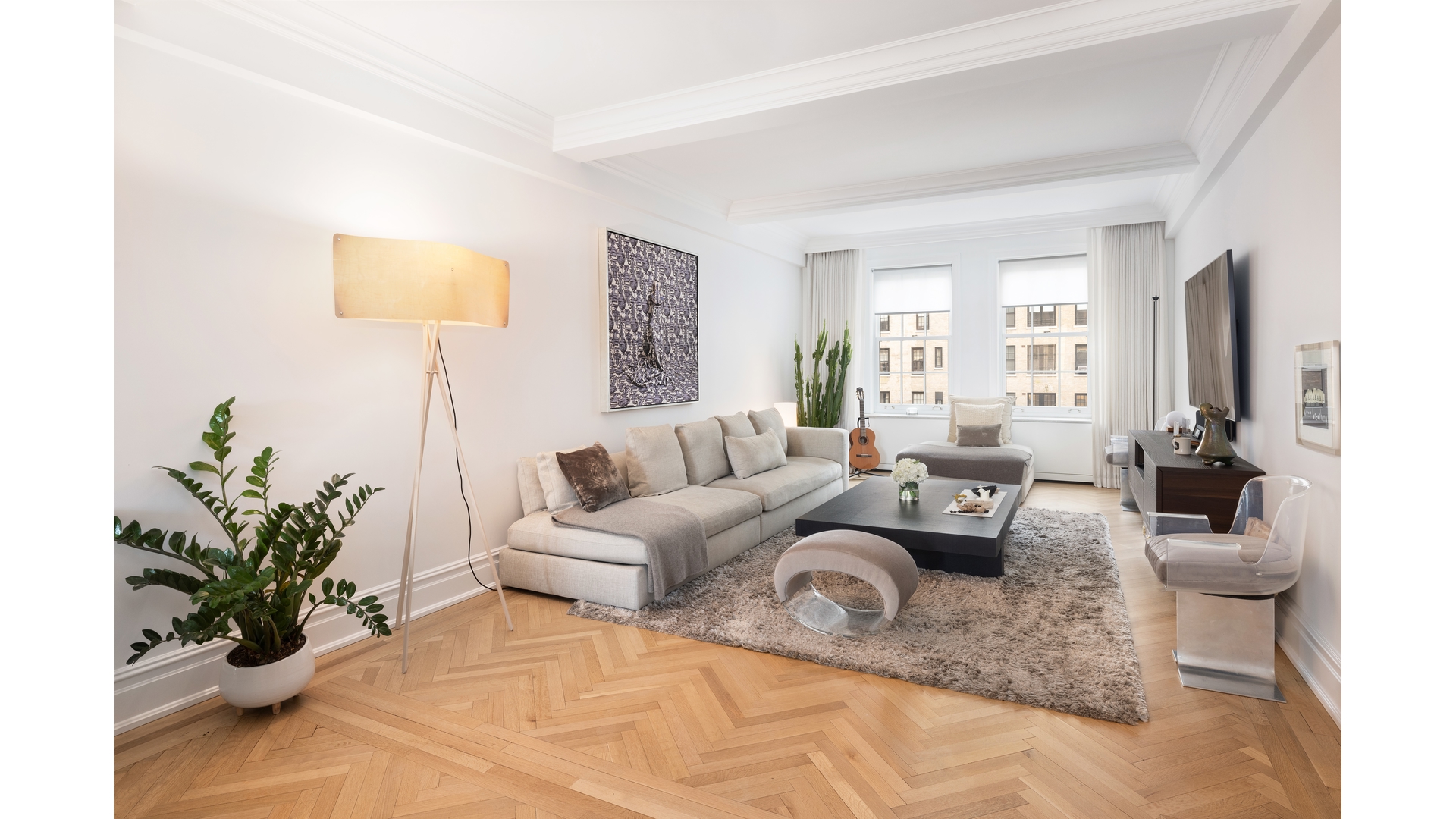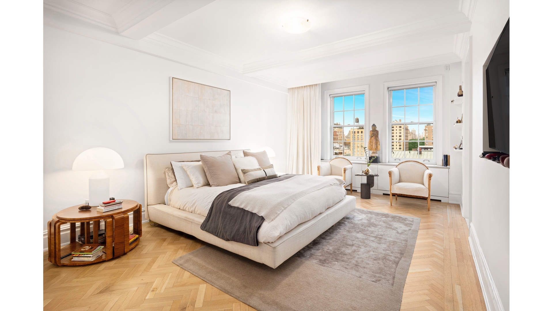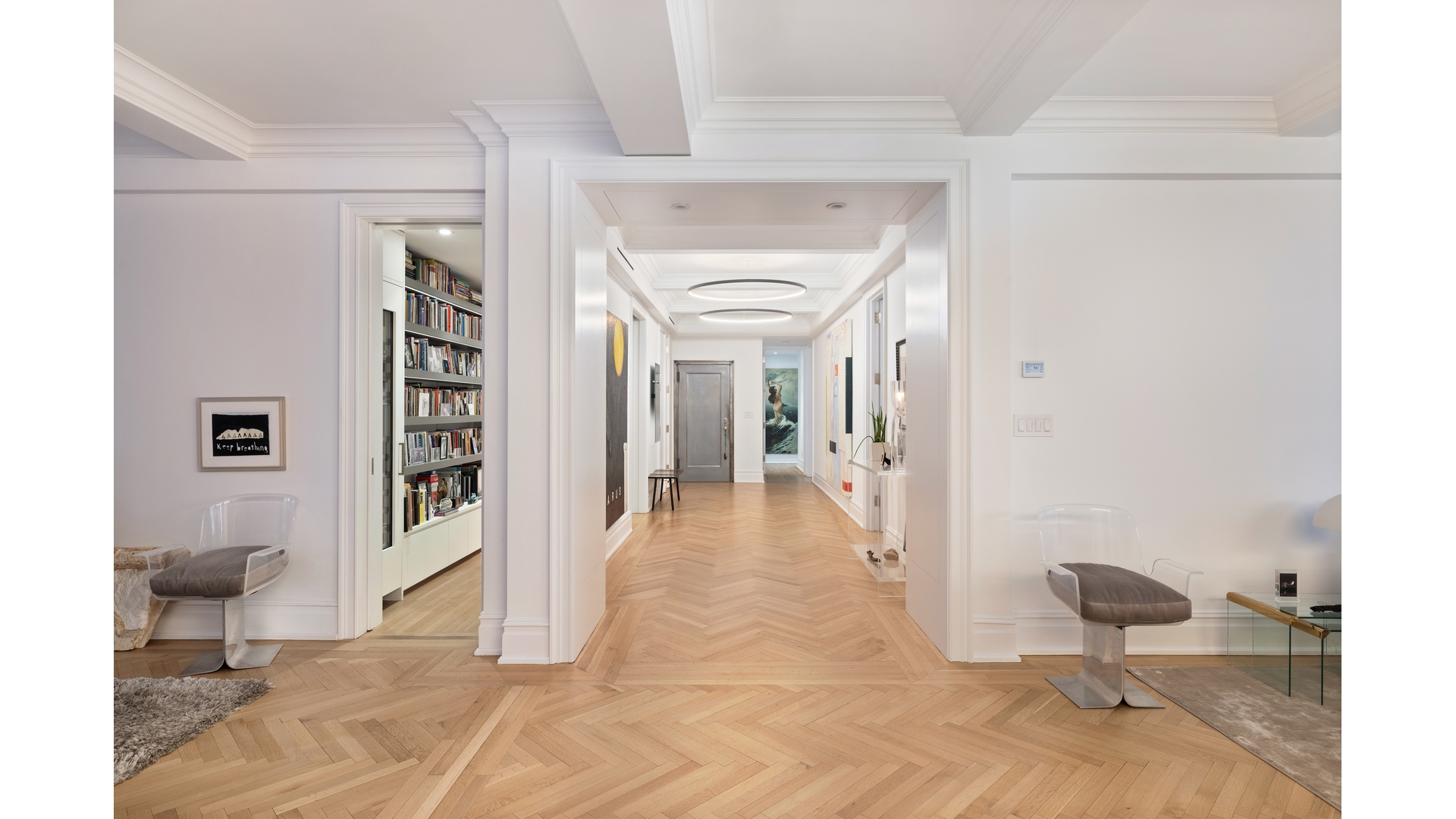 Welcome to residence 9C at 1185 Park Avenue, a reimagined classic eight that balances prewar grandeur and chic modern living. This gracious sun filled home with beautiful views has been thoughtfully renovated with impeccable craftsmanship, and high-end finishes. Positioned on a high floor with rooms facing West over Park Avenue, 9C is bathed in natural light from the large windows that offer open views of the city skyline and treetops of Central Park. Entering the dramatic 28-foot gallery, you are immediately wowed by this home's grand scale. The spectacular open living and dining room seamlessly open into an airy, loft-like space ideal for entertaining. The living room features a wood-burning marble fireplace and expansive windows overlooking Park Avenue, ensuring brilliant light all day. The dining room faces the building's beautifully landscaped central garden, offering a serene backdrop for gatherings or quiet time at home. The large west-facing primary suite is a sanctuary of comfortable sophistication, featuring two large walk-in closets and a marble bathroom. There are two additional oversized bedrooms, each with generous closet space and en-suite marble bathrooms that reflect the home's stylish aesthetic The windowed chef's kitchen is designed with thick marble countertops, custom cabinetry and top-of-the-line Rocky Mountain hardware. An adjoining butler's pantry offers flexible space and storage, while a breakfast room with garden views creates a casual, sunlit area for dining. There is a dedicated laundry room fitted with a full size, vented washer and dryer. There is also a stylish powder room, and additional storage. Featuring gorgeous herringbone floors, soaring ceilings and Central Air conditioning with multiple zones, 9C is an extraordinary home.1185 Park was designed by the renowned architects, Schwartz and Gross, in 1929. The building's striking Gothic triple arch entrance and rare Port -Cochere create a dramatic first impression leading into the meticulously landscaped garden. In addition to the full-time building staff, amenities include an upscale gym, roof garden, children's playroom and private storage. There is a 2% flip tax paid by purchaser. The building is situated moments away from Central Park, museums and some of NYC's best restaurants and shopping.