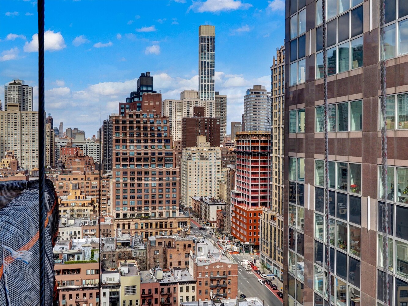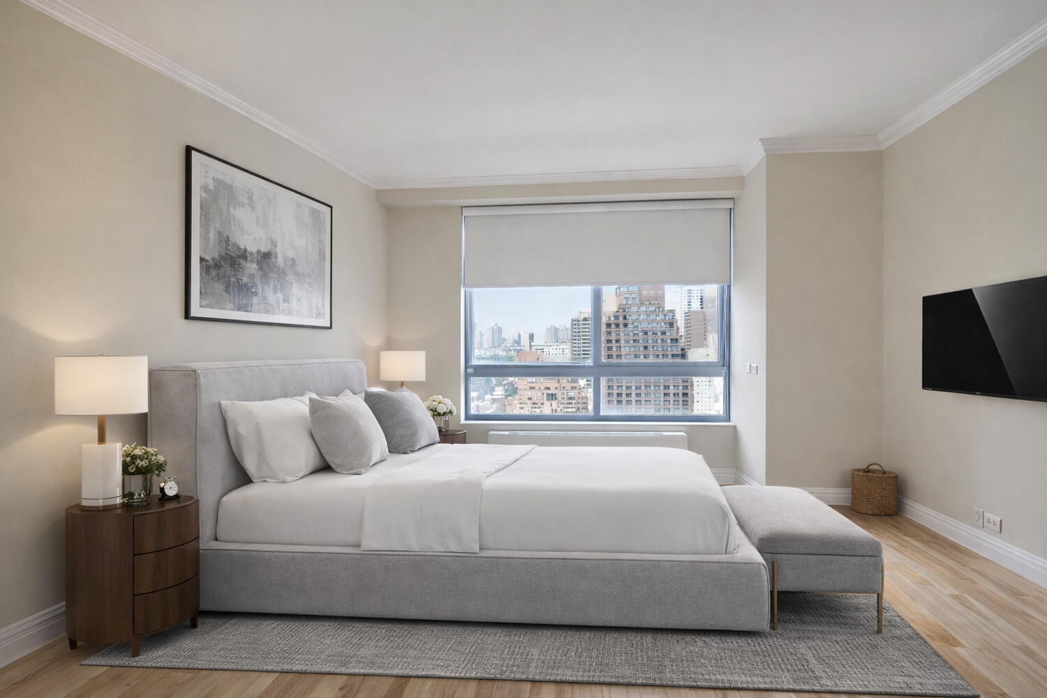 Positioned on a high floor, this coveted corner layout offers split bedrooms and expansive living space, excellent for both comfortable living and elegant entertaining. The sun-drenched living and dining area showcases panoramic skyline views to the north, along with sweeping vistas of the East River and Long Island City through floor-to-ceiling windows. The seamless access to the wraparound balcony enhances the indoor-outdoor experience, creating a perfect setting for hosting or relaxing.