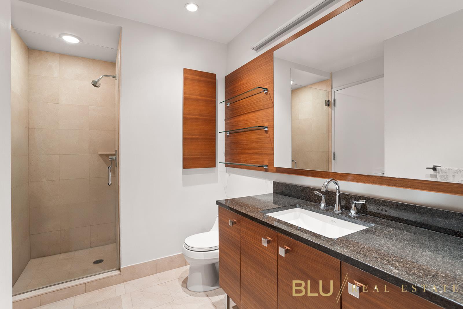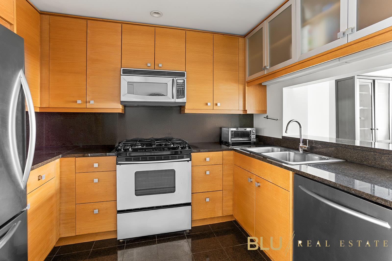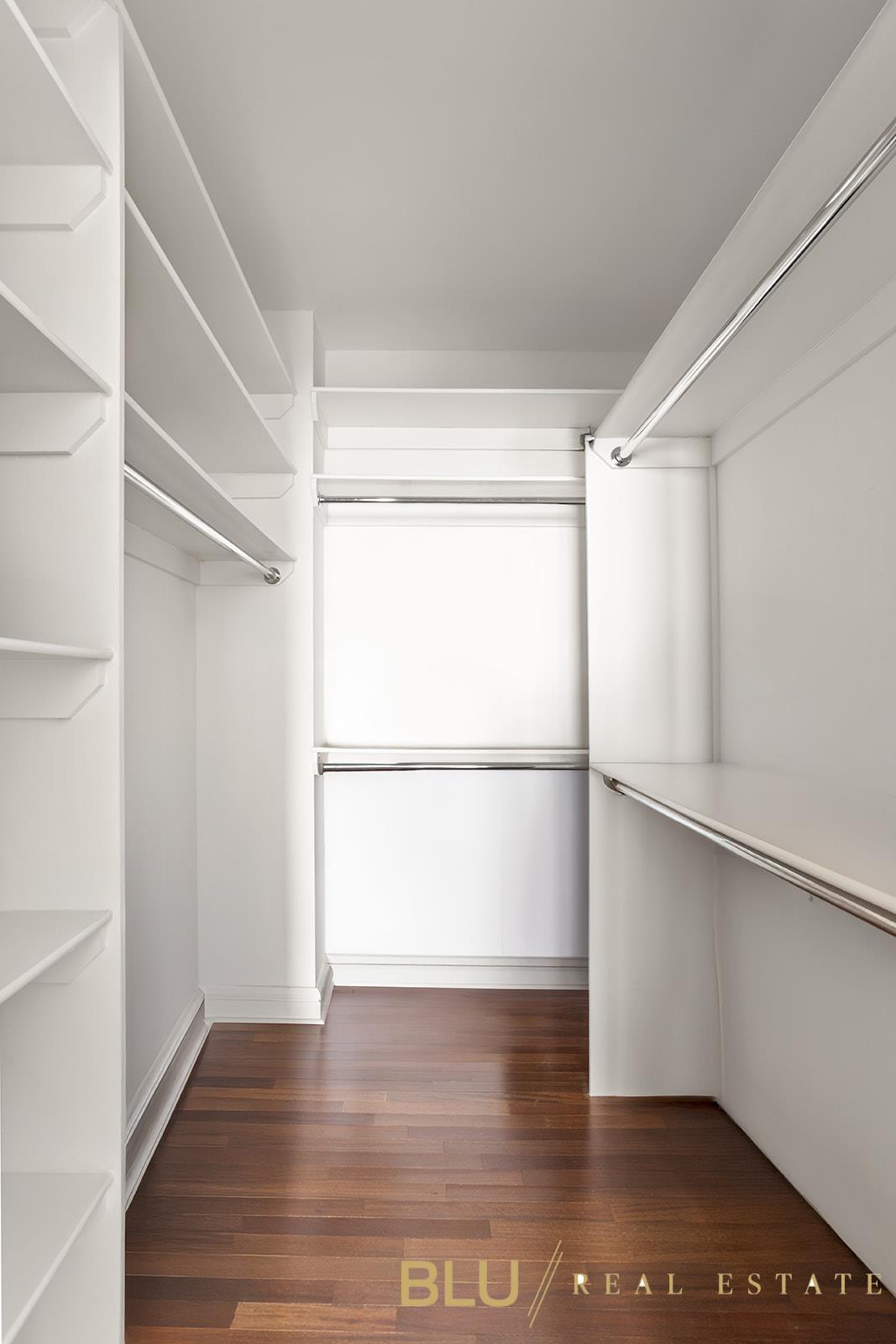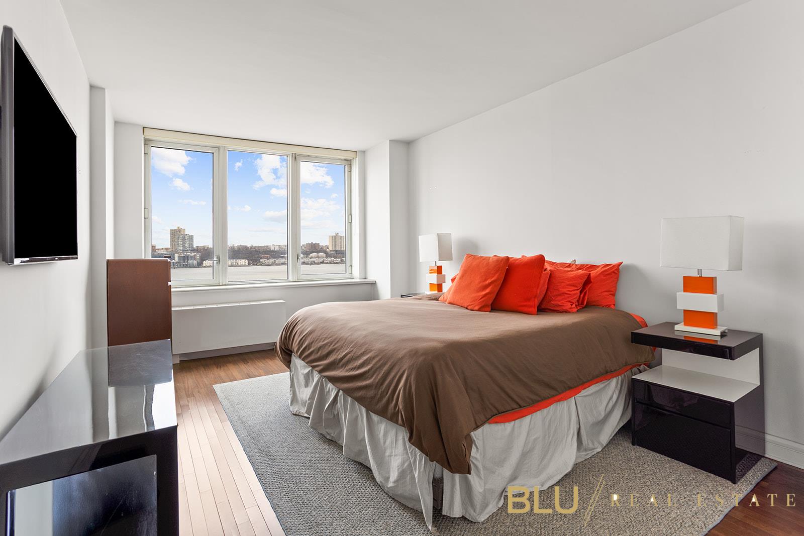 The layout is thoughtfully arranged, with both bedrooms positioned along the river-facing exposure. Each bedroom is oversized, and the primary suite features a walk-in closet, an additional large closet, and an en-suite marble bathroom with a separate shower and tub. A second marble bathroom and additional hallway closets further enhance the home’s exceptional storage and functionality. The kitchen offers a spacious, well-designed layout with ample counter space, ideal for both everyday use and entertaining with ease. Hardwood floors, excellent storage throughout, and an in-unit washer/dryer complete the home.