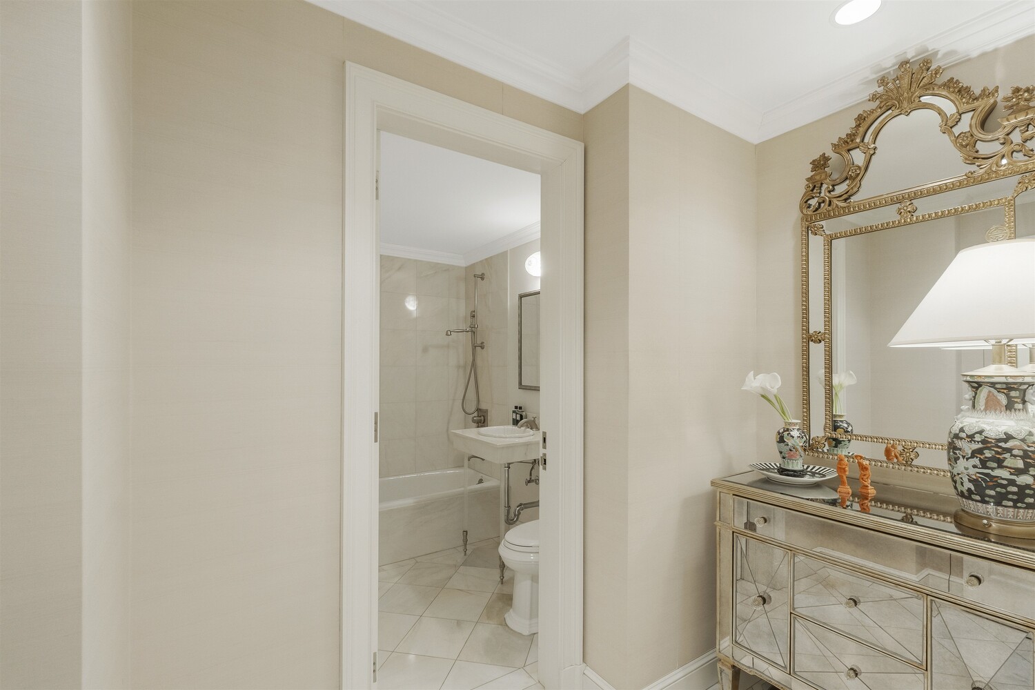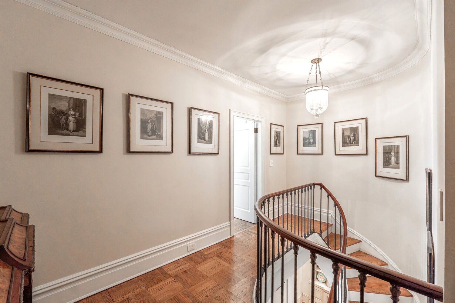 Entry is available on both the 10th and 11th floors. On the main level, a sophisticated gallery entry leads you left to a sunny 25-foot living room, framed by expansive east-facing windows. Right of the gallery, a formal dining room impresses with magnificent hand-painted Gracie wallpaper, hidden storage, and western city views. Adjacent is the masterfully crafted, 20-foot, windowed eat-in kitchen, featuring luxurious stone countertops, and top-of-the-line appliances from Wolf, SubZero, and Bosch. The main level is completed by a versatile fourth bedroom or office and one and a half elegantly appointed baths with Sherle Wagner fixtures.