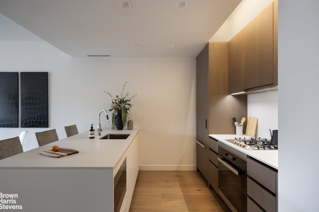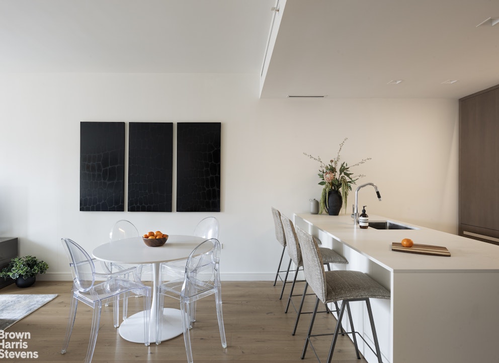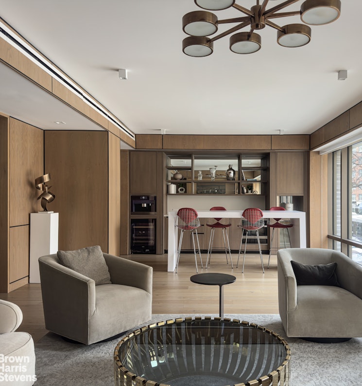 The interior features 7-inch wide plank oak flooring with a custom smoked oil stain and Valli & Valli hardware on all grand entry and interior doors. The open Poliform kitchen, designed by Champalimaud, includes a white matte lacquer breakfast bar, custom smoked-oak cabinetry, and white sand Quartzite countertops and backsplash in a honed suede finish. The kitchen is fully equipped with an integrated Miele appliance package and Dornbracht fixtures. The master bath is encased in Turkish Lilac marble walls with white stone floors, a custom RiFRA vanity, and Dornbracht fittings. A dedicated laundry closet houses a Miele Prestige washer and dryer. The residence features a state-of-the-art Daikin heating and cooling system and motorized shades at all windows to ensure seamless climate and light control.