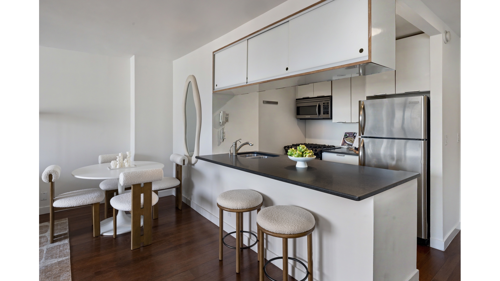 The apartment has been thoughtfully updated from its original layout, with an enlarged bathroom and a more generous bedroom walk-in closet.