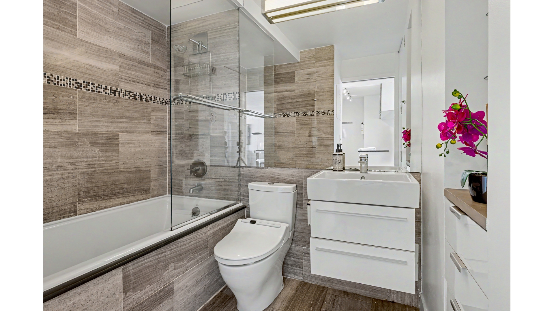 The spa-inspired bathroom has been reimagined with a glass enclosed Kohler deep soaking tub, Duravit & Hansgrohe fixtures and impressive storage, including a full closet.