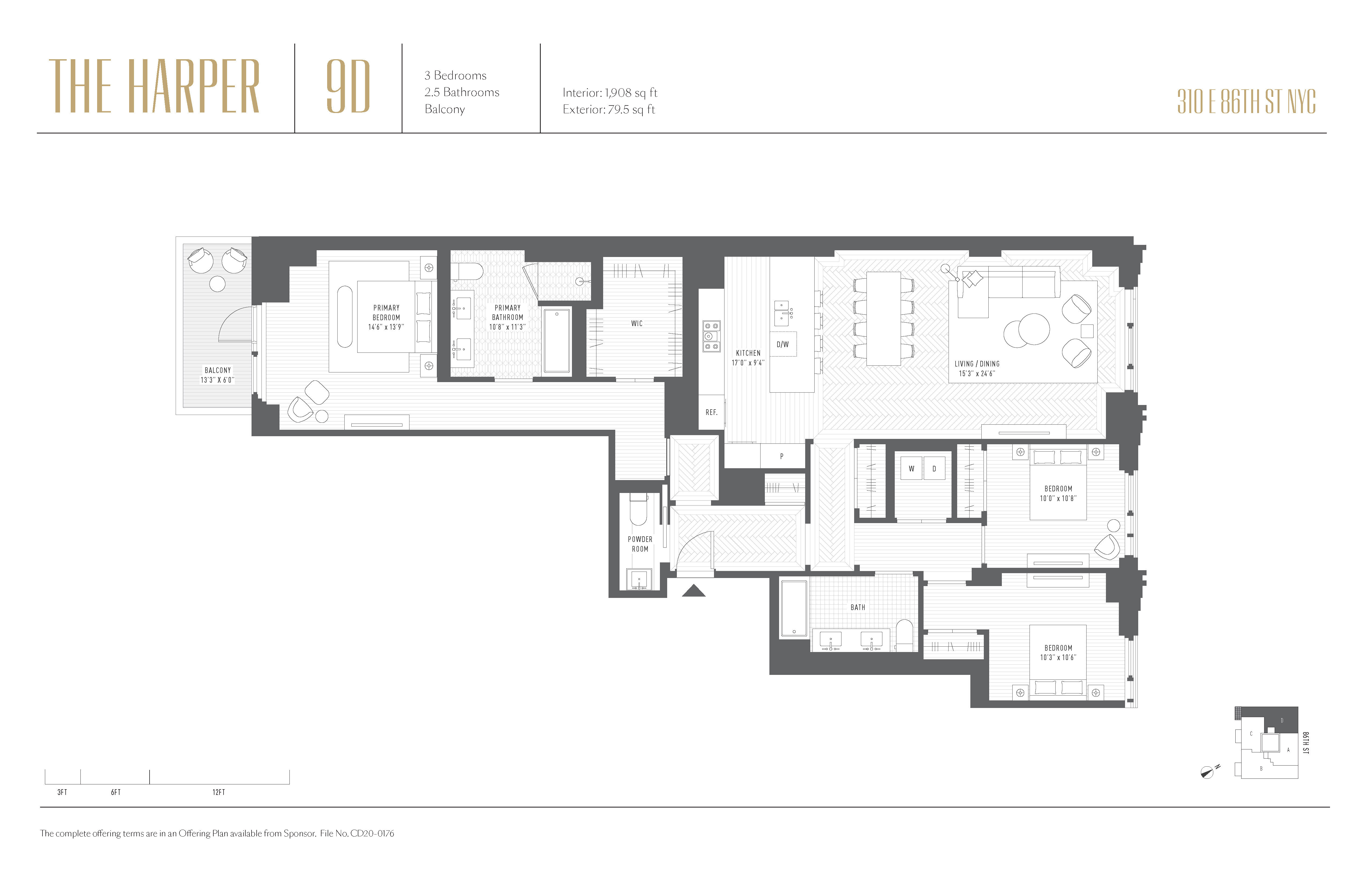 Introducing The Harper, the Upper East Side’s newest condominium, inspired by the timeless appeal of Art Deco and the sleek elegance of Bauhaus design. Residence 9D is a highly desired split three-bedroom with an expansive living and dining room. Immediately upon entering the home, you are greeted by a gracious gallery and foyer. The open kitchen and living room anchor the home. Custom-designed by Poliform in collaboration with ODA, the kitchen boasts warm matte lacquer cabinetry adorned with antique brass hardware from WaterWorks. The Taj Mahal quartzite countertop and backsplash exude elegance, while Miele integrated appliances offer both exquisite design and top-notch performance. Separated in its own private wing, the primary bedroom is positioned at the south end of the home and overlooks the quaint and charming gardens beneath. The primary bathroom is a sanctuary of refinement, enveloped in Crema Luna limestone complemented by Namibia white marble. Radiant heated floors and high-end plumbing fittings from WaterWorks elevate the luxurious experience. Additional features of this apartment include a separate powder room, white oak flooring, solid-core wood doors with Valli & Valli hardware, a side-by-side washer and dryer, and a high-efficiency central VRF system for heating and cooling. As a resident of The Harper, you’ll enjoy an array of amenities and services. From the moment you arrive, you’ll be welcomed into the lobby by a full-time doorman. Stay active in the state-of-the-art fitness center, equipped with the latest exercise equipment. A thoughtfully curated children’s playroom and makers studio are designed to inspire, create, and play. For those with a passion for music, a dedicated music studio awaits, providing a private sanctuary for practicing or recording. A separate teen lounge offers a space for relaxation and socializing. Built by prominent developer IGI and designed by award-winning architect ODA, The Harper masterfully blends the iconic luxury found in traditional Upper East Side homes with the modern conveniences of condominium living. From the meticulously crafted limestone façade to the exquisitely adorned lobby and throughout the interiors, every detail reflects a commitment to continuity and style. The listing images represent various units in the building. The complete offering terms are in the offering plan available from Sponsor. File No. CD20-0176.
