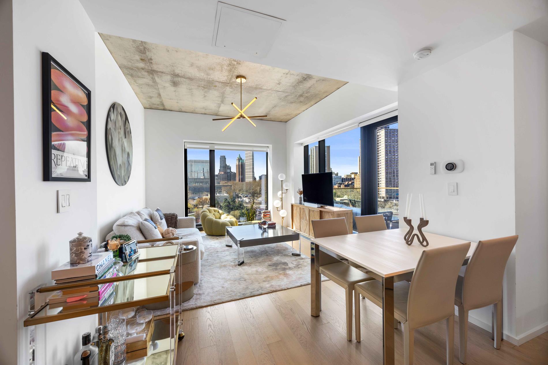 The thoughtfully designed layout features spacious living and dining areas ideal for both entertaining and everyday living, complemented by oversized 8 ft windows that frame postcard-worthy water views. A sleek, modern kitchen is outfitted with top-of-the-line Boche appliances, custom oak cabinetry, Corian countertops and premium finishes, seamlessly integrating style and functionality.
