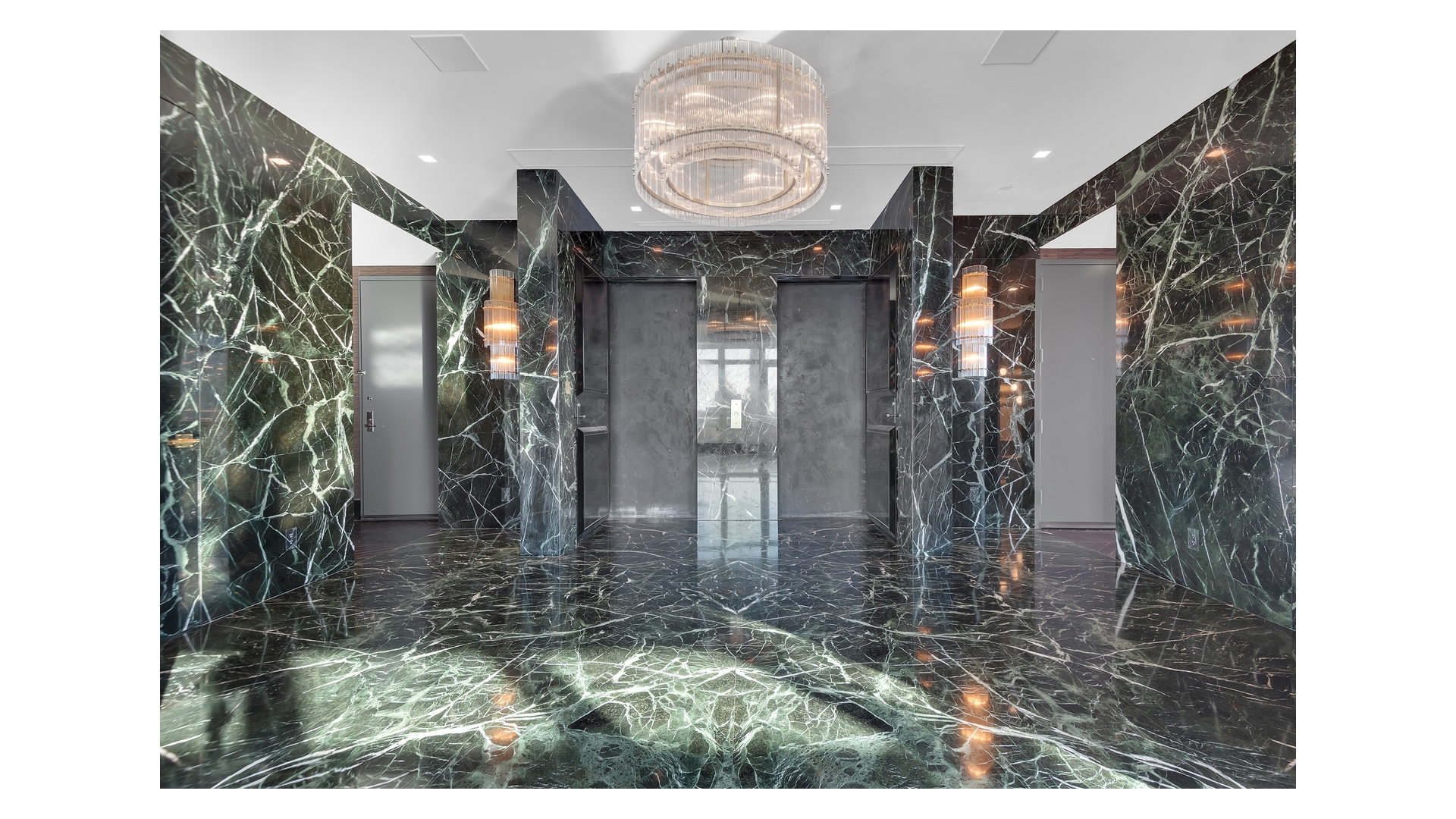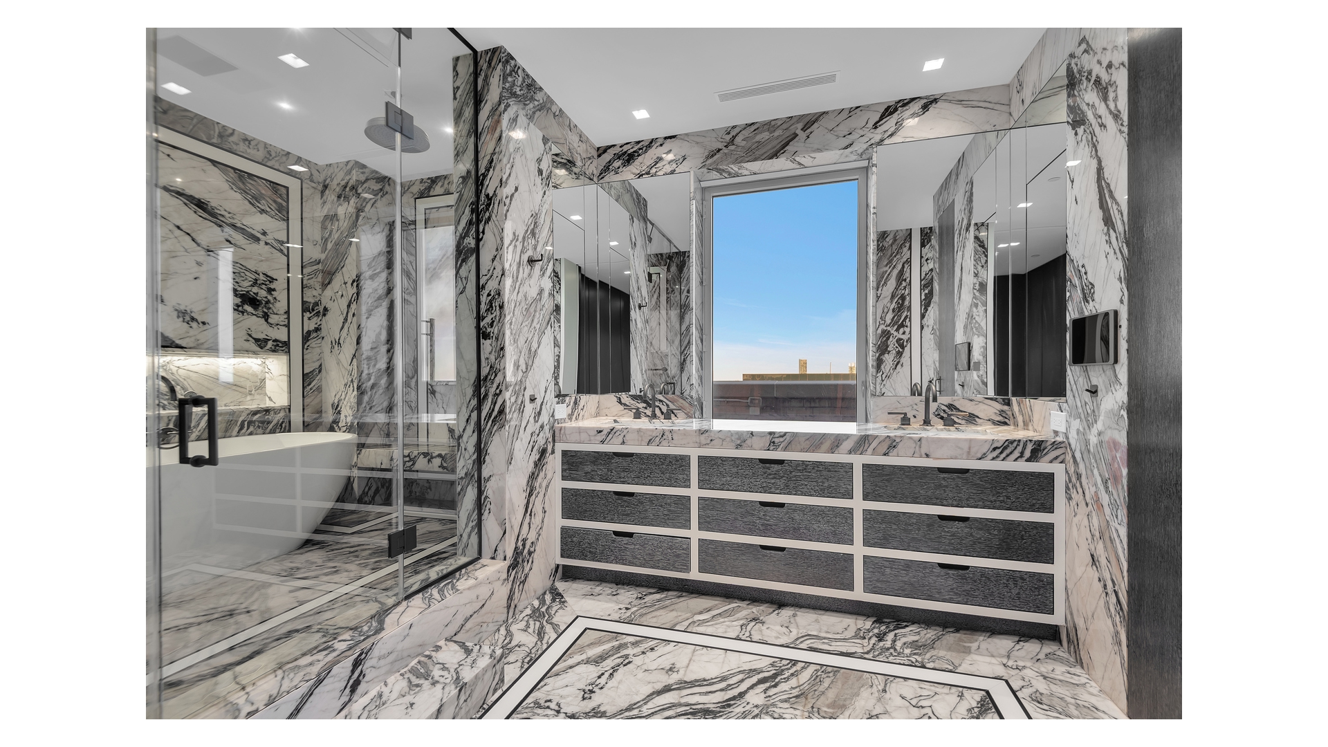 The windowed chef's kitchen is outfitted with top-tier appliances and sleek stone surfaces, seamlessly connecting to the main entertaining areas. The primary suite is a private retreat, complete with a luxurious marble bath and direct access to the terrace.