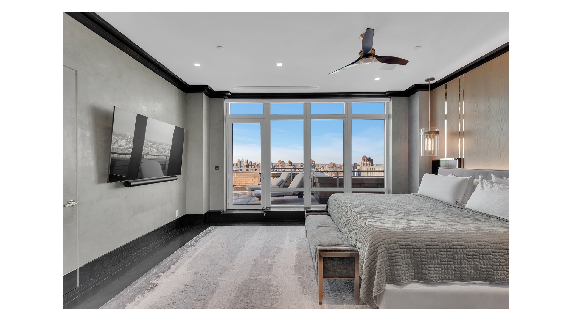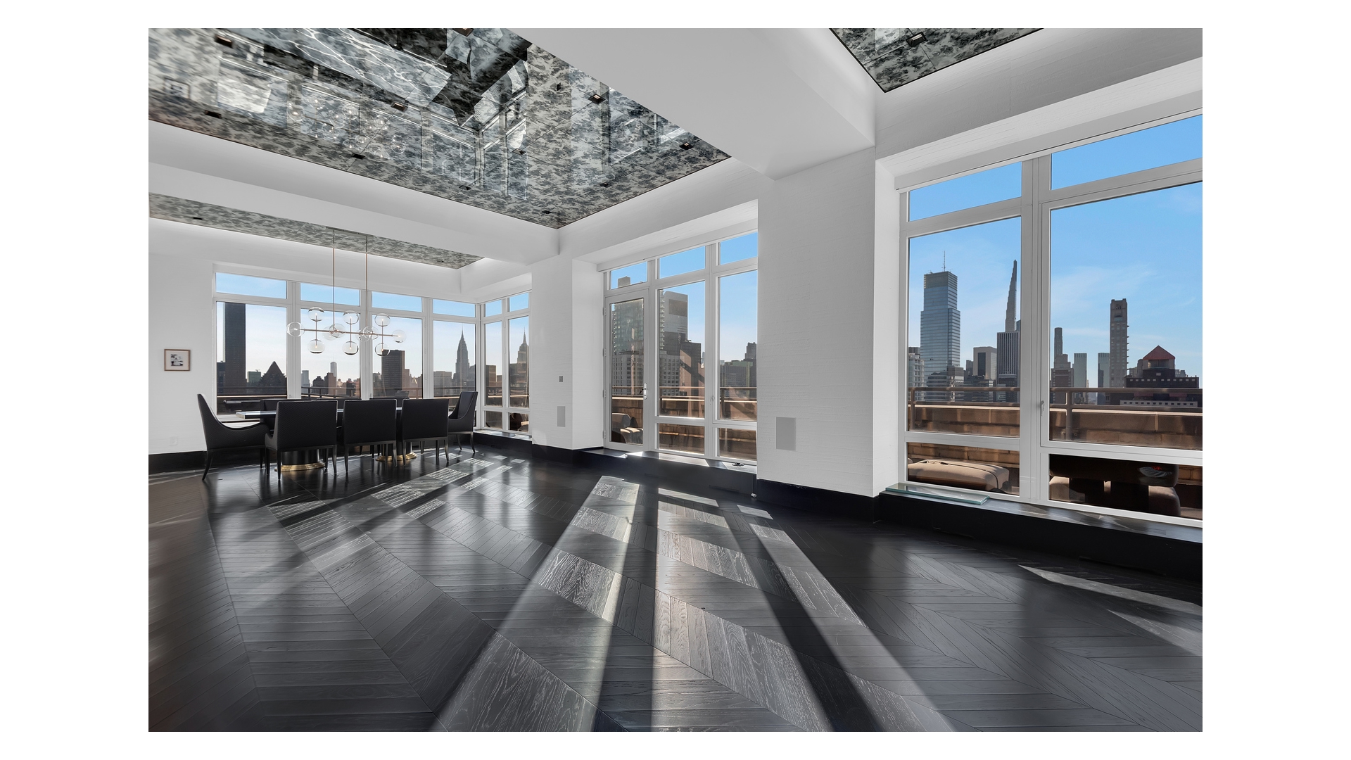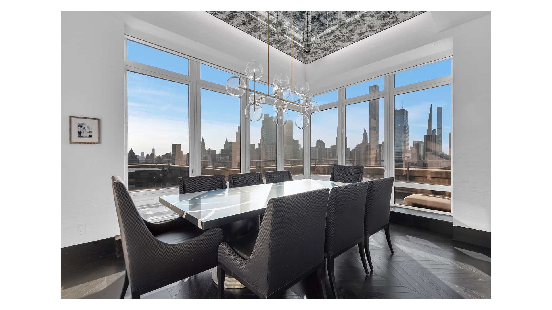 The crown jewel of the home is the expansive wraparound terrace-offering multiple seating and dining areas and capturing sweeping 360-degree views of the Manhattan skyline, East River, and beyond.