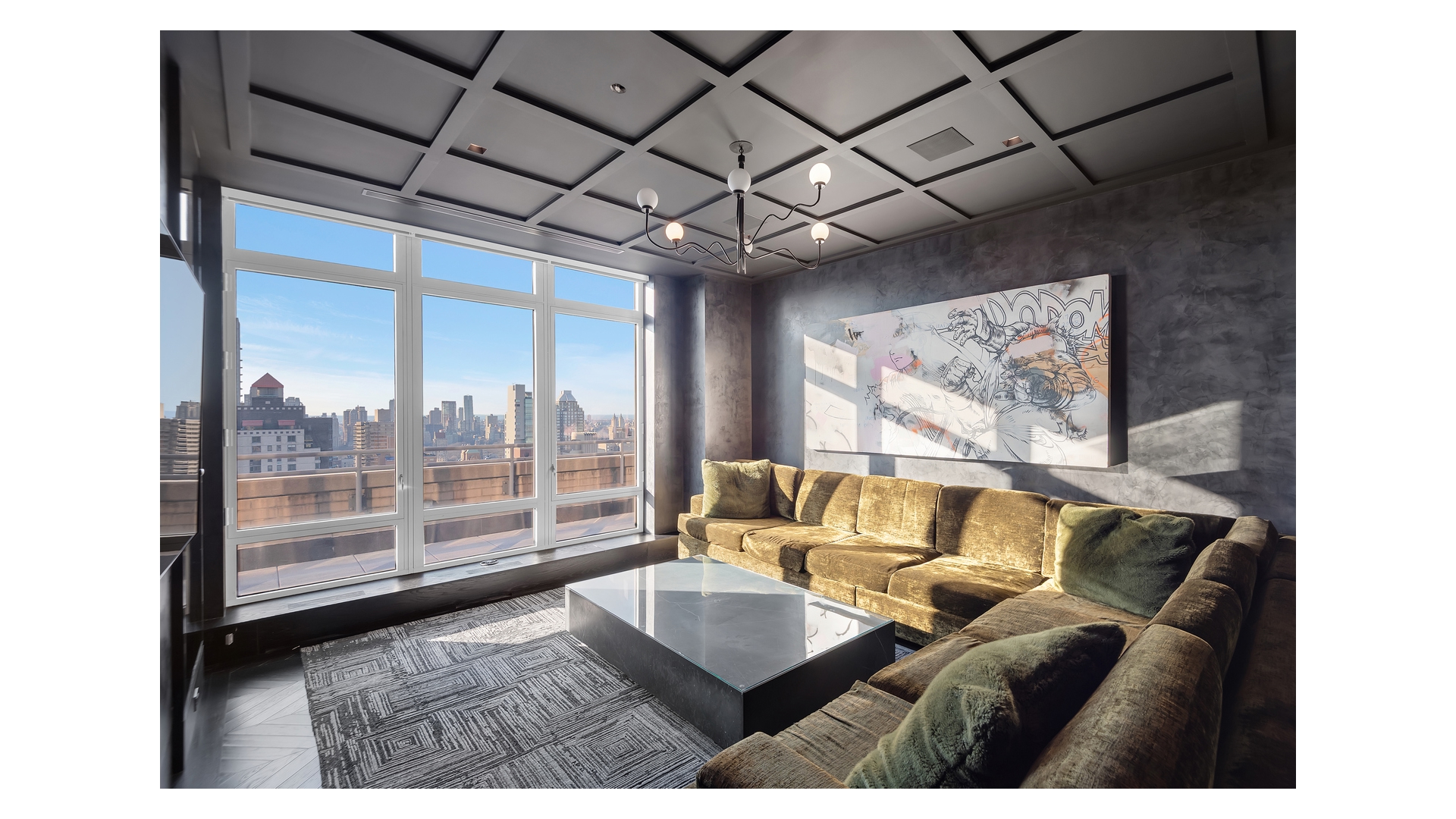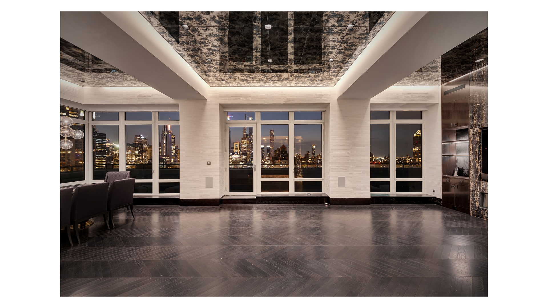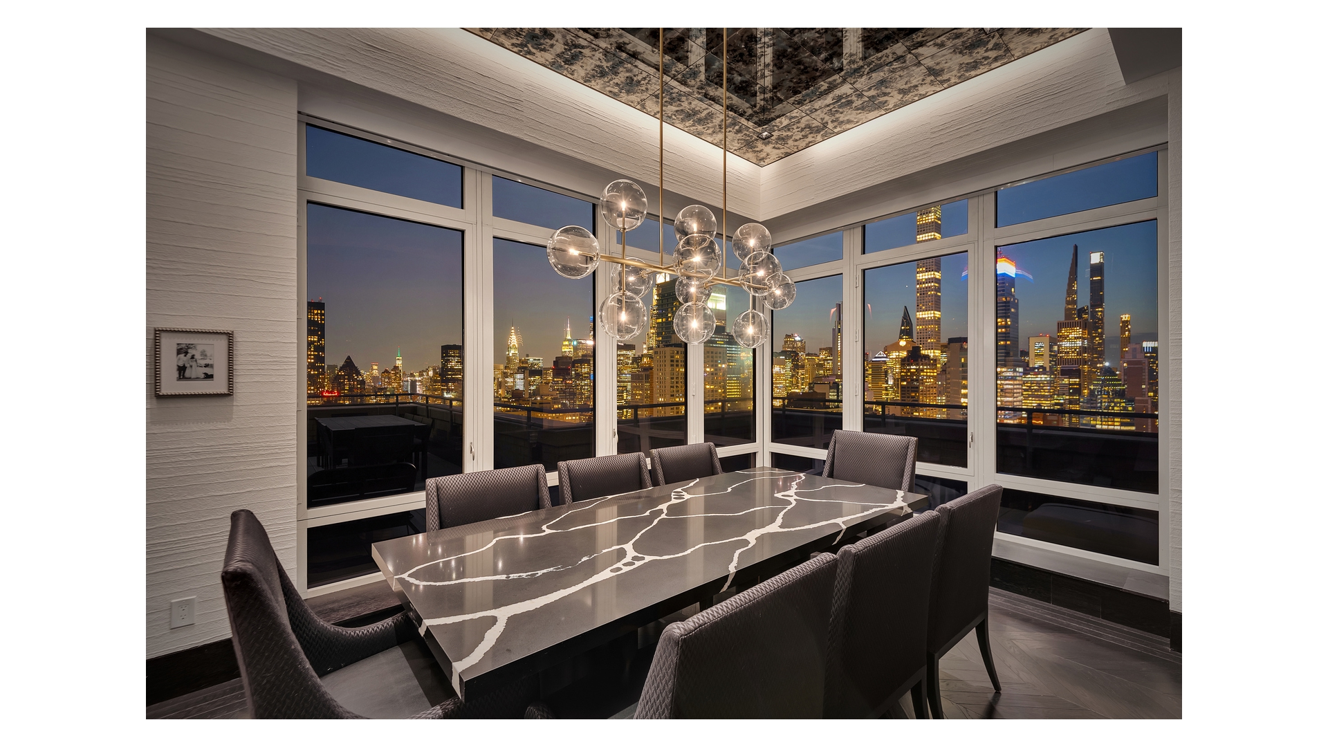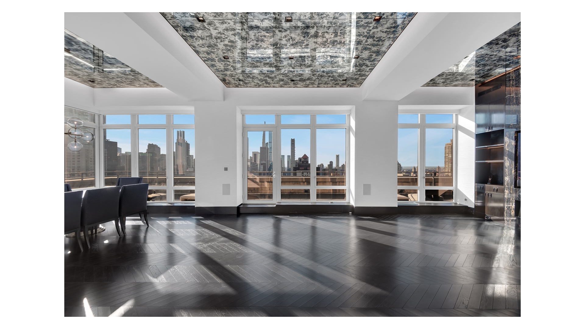 The crown jewel of the home is the expansive wraparound terrace-offering multiple seating and dining areas and capturing sweeping 360-degree views of the Manhattan skyline, East River, and beyond.