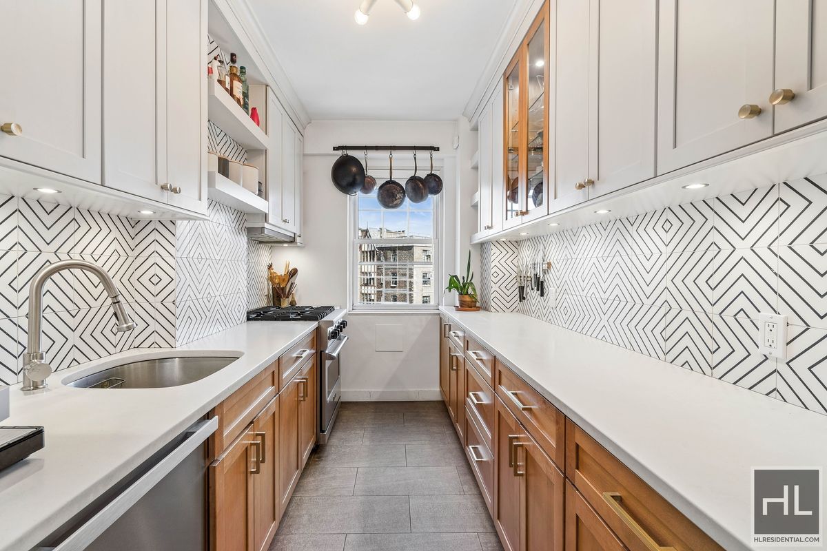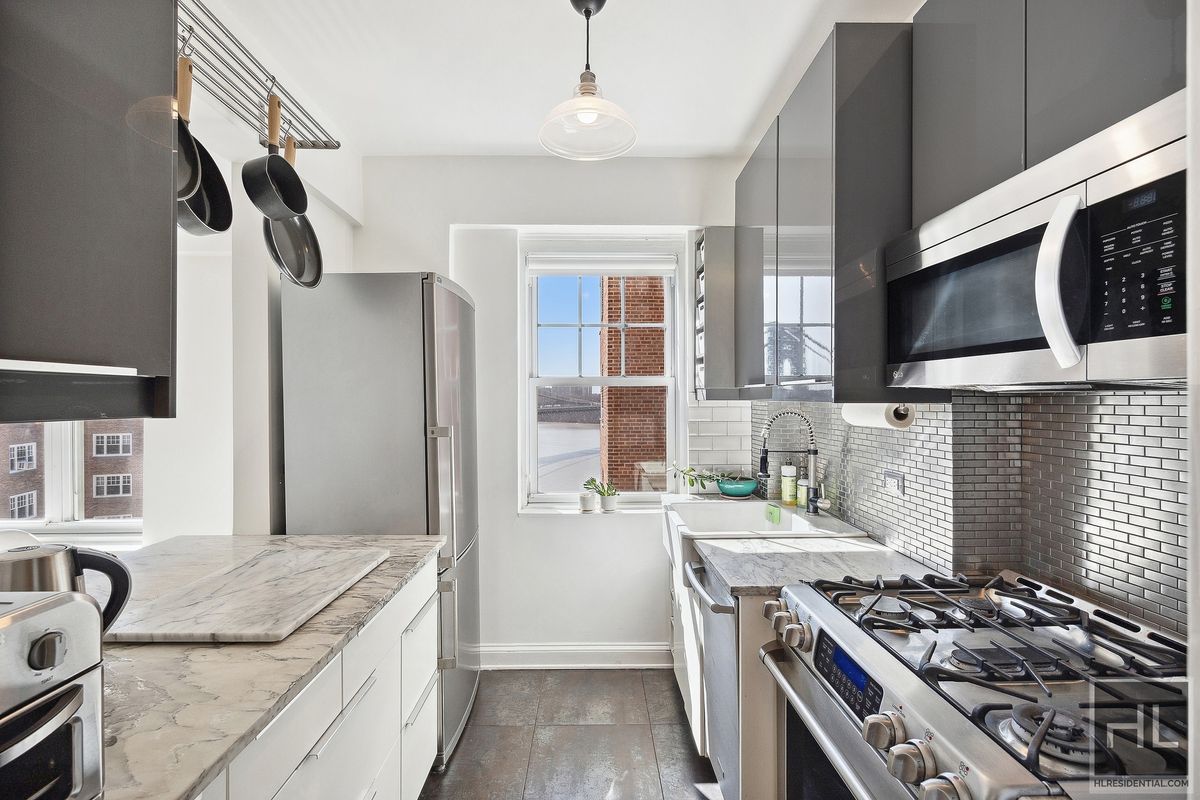 Hudson River and GW Bridge. A windowed kitchen-thoughtfully updated with premium