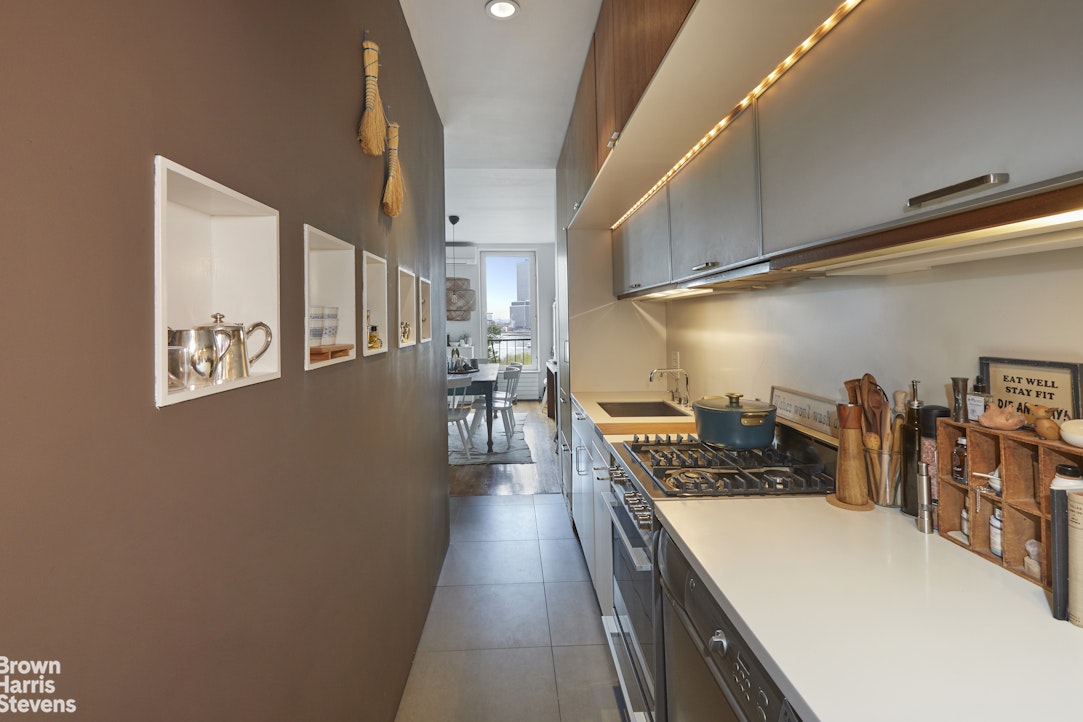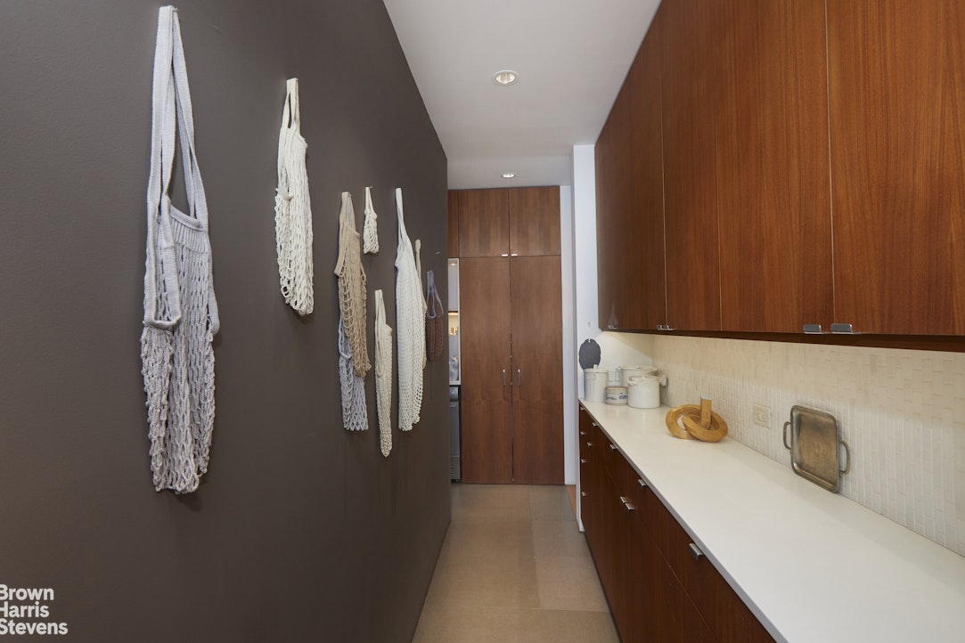 A walk-thru galley kitchen just off the living area has been designed to not only take advantage of the view but to make the best use of the high ceilings for maximal storage. It is equipped with a Sub-zero refrigerator, Bosch dishwasher, a Fisher Paykel range and an Asko washer and dryer. The adjacent butler's pantry is cleverly designed for additional storage and counter prep space.