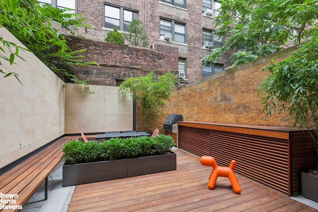 The garden-level family room offers both comfort and functionality, with abundant custom cabinetry for storage and seamless access to your private outdoor oasis. Step outside into a beautifully designed garden retreat, complete with a wood deck, built-in seating, lush greenery, and a dedicated outdoor cooking area-perfectly suited for quiet relaxation or lively entertaining with guests. Just off the family room, two secondary bedrooms share a well-appointed full bathroom, providing an ideal layout. Further down the hallway, the serene primary suite awaits, featuring a spacious walk-in closet and a spa-inspired bath. Indulge in a glass-enclosed shower with a built-in bench, Dornbracht fixtures, and a separate toilet room with a sleek wall-hung design. For added convenience, a Asko washer and vented dryer complete this level, blending luxury with everyday practicality.
