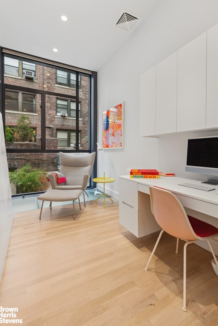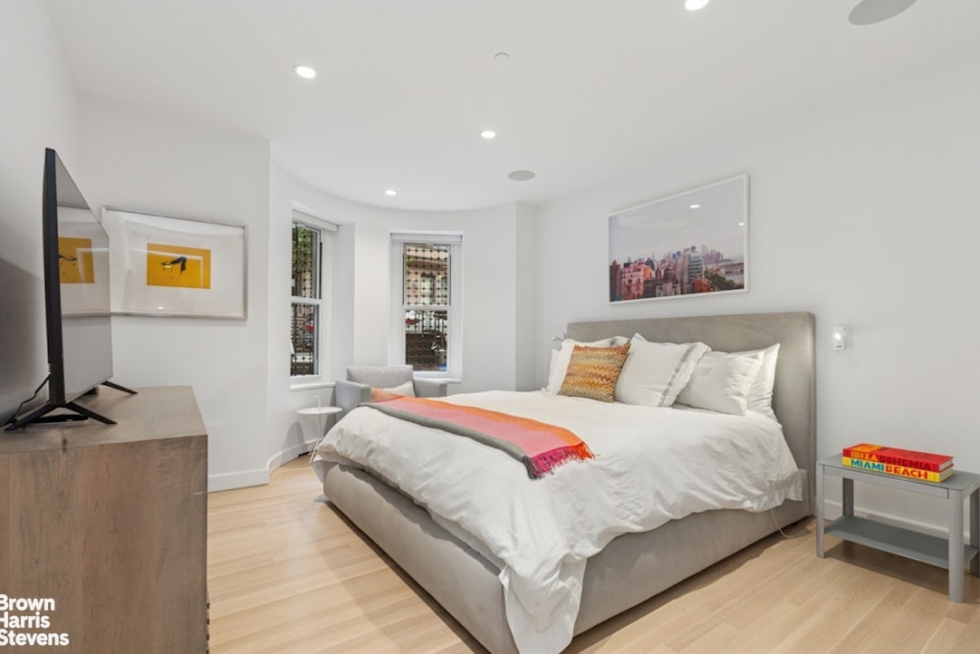 The parlor-level entry sets the tone with custom coat and shoe storage designed for both elegance and practicality. To the left, a sleek chef's kitchen gleams with top-of-the-line Miele, Wolf, and Sub-Zero appliances, complemented by a convenient seated bar top for casual dining or conversation. The generously proportioned dining room boasts soaring 12.6-foot ceilings and is framed by dramatic 9-foot curved glass bay windows, flooding the space with southern light and offering picturesque views over West 71st Street. Comfortably accommodating eight guests, making it ideal for both intimate dinners and larger gatherings. To the right, the expansive living room is bathed in northern light through dramatic floor-to-ceiling windows and enhanced by custom built-ins and lofty 11-foot ceilings, creating an atmosphere of airiness and grandeur. This level also includes a sunlit home office and a full bathroom appointed with Dornbracht fixtures and a wall-hung toilet. Overlooking the private garden, a balcony offers a tranquil retreat, while a