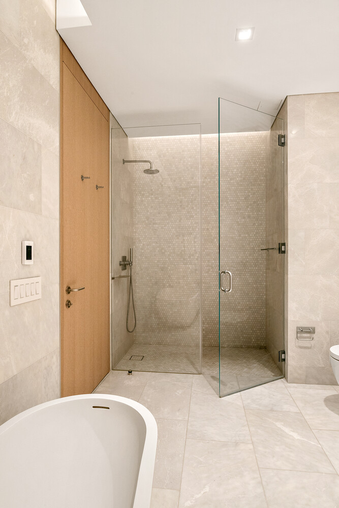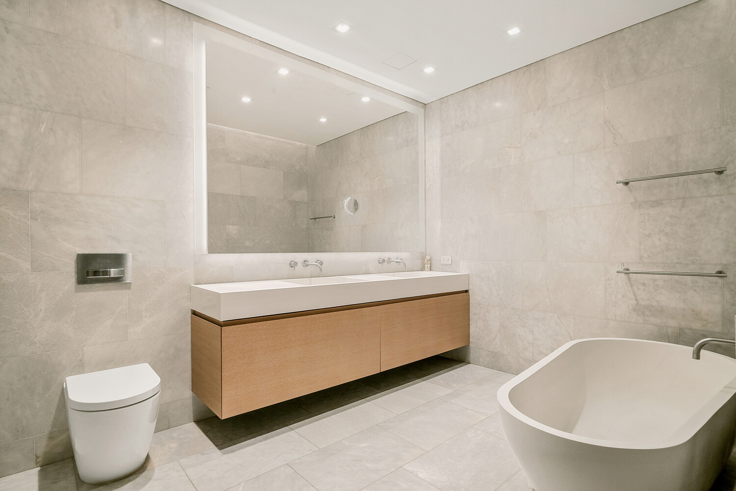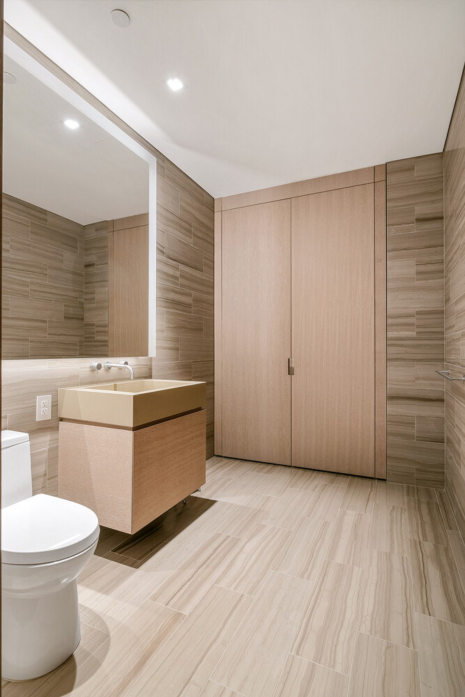 A private study with two fitted closets serves equally well as a guest room or home office, giving you the flexibility and comfort. A powder room adjacent to the study features honed Athens tan marble tiles, custom Apaiser stone vanity with oversized floating backlit mirror and custom cabinetry by Minimal Cucine. A full-size washer and dryer complete this stunning residence.