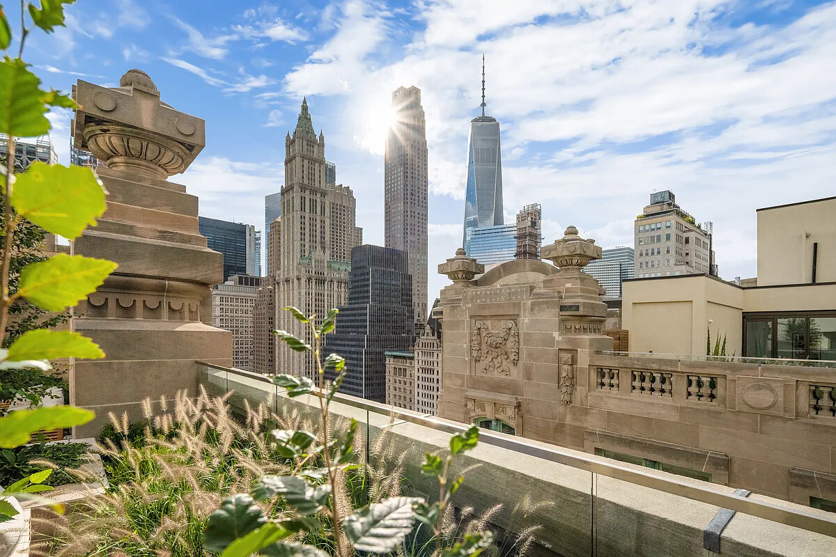 49 Chambers Street is a landmark reimagined. The historic Emigrant Industrial Savings Bank has been transformed into just 72 luxury residences, and the amenity collection reflects that exclusivity: a 50' swimming pool beneath a vaulted ceiling inspired by the original Banker's Hall, hammam, sauna, steam rooms, spa treatment rooms, yoga studio, fitness center, resident lounge, screening room, game room, children's playroom, bike storage, and resident storage. A landscaped rooftop with indoor and outdoor garden spaces, dining areas, and sweeping park views crowns the building.