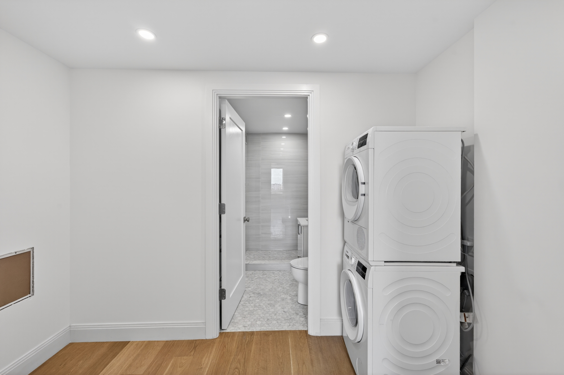 The bathroom is tastefully appointed in classic white marble and outfitted with premium Waterworks fixtures, delivering a spa-like experience. A standout feature of this residence is its in-unit washer and dryer-an uncommon and highly desirable amenity within the building.