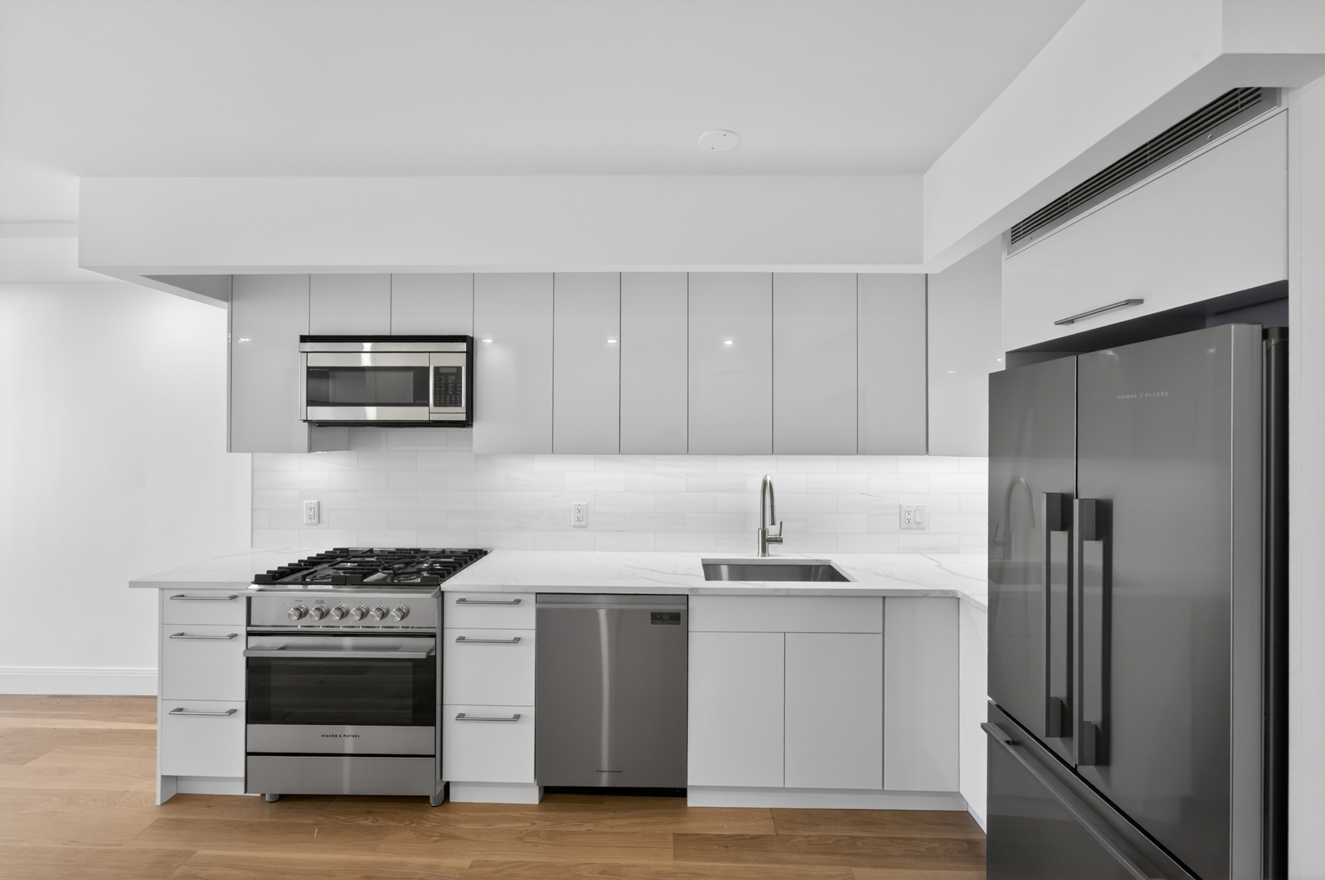 The apartment has been thoughtfully updated with rich hardwood floors that run throughout the entire space, creating a warm and cohesive feel. The open kitchen is both stylish and practical, featuring a sleek stainless-steel Fisher & Paykel appliance suite paired with elegant Corian countertops-perfect for both daily living and entertaining. Sophisticated soffited lighting enhances both the living room and bedroom, adding a refined ambiance to the home.