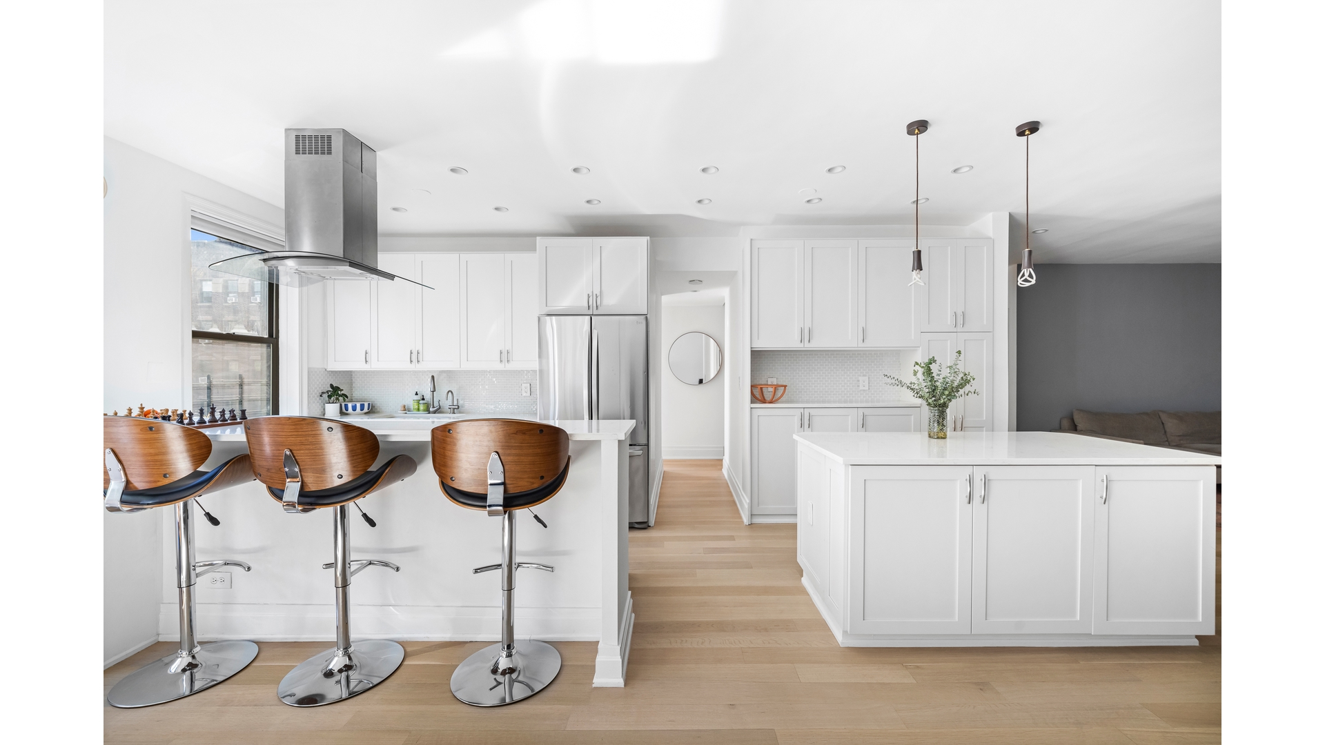 Beyond the foyer wall is an enormous east-facing open-plan living/dining space that can be configured in many different ways to match your needs. Three large east-facing windows create a gorgeous wall-of-windows effect that lends a bright and airy feel to the room. Adjacent to this main area is a luxuriously stylish kitchen that has so many great features: lots of counter space, quartz countertops, a recessed nook to neatly house appliances, a big baker's island and a breakfast bar that both have tons of storage, a wine fridge, beautiful custom cabinetry, water filter, and recessed lighting. Off the kitchen, and opposite the main living space, is a spacious second common room that can be used as office space, playroom, den, library or media room.