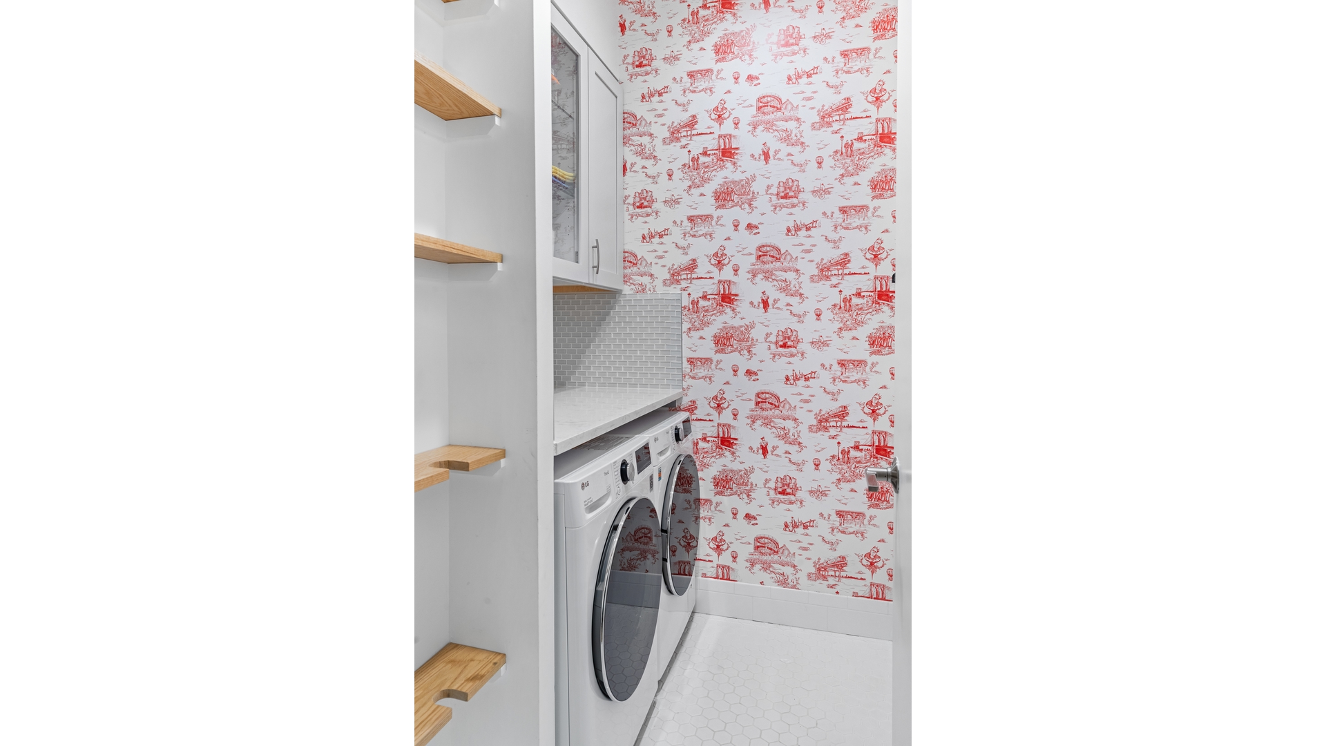 This special home also has wide-plank oak flooring with cork soundproofing subfloor throughout and a dedicated laundry room with a side-by-side washer/dryer, storage, and a convenient surface for folding. Stylish details abound such as tasteful and unique light fixtures, Flavor Paper wallpaper in two rooms, and custom closet doors from Sliding Door Company.