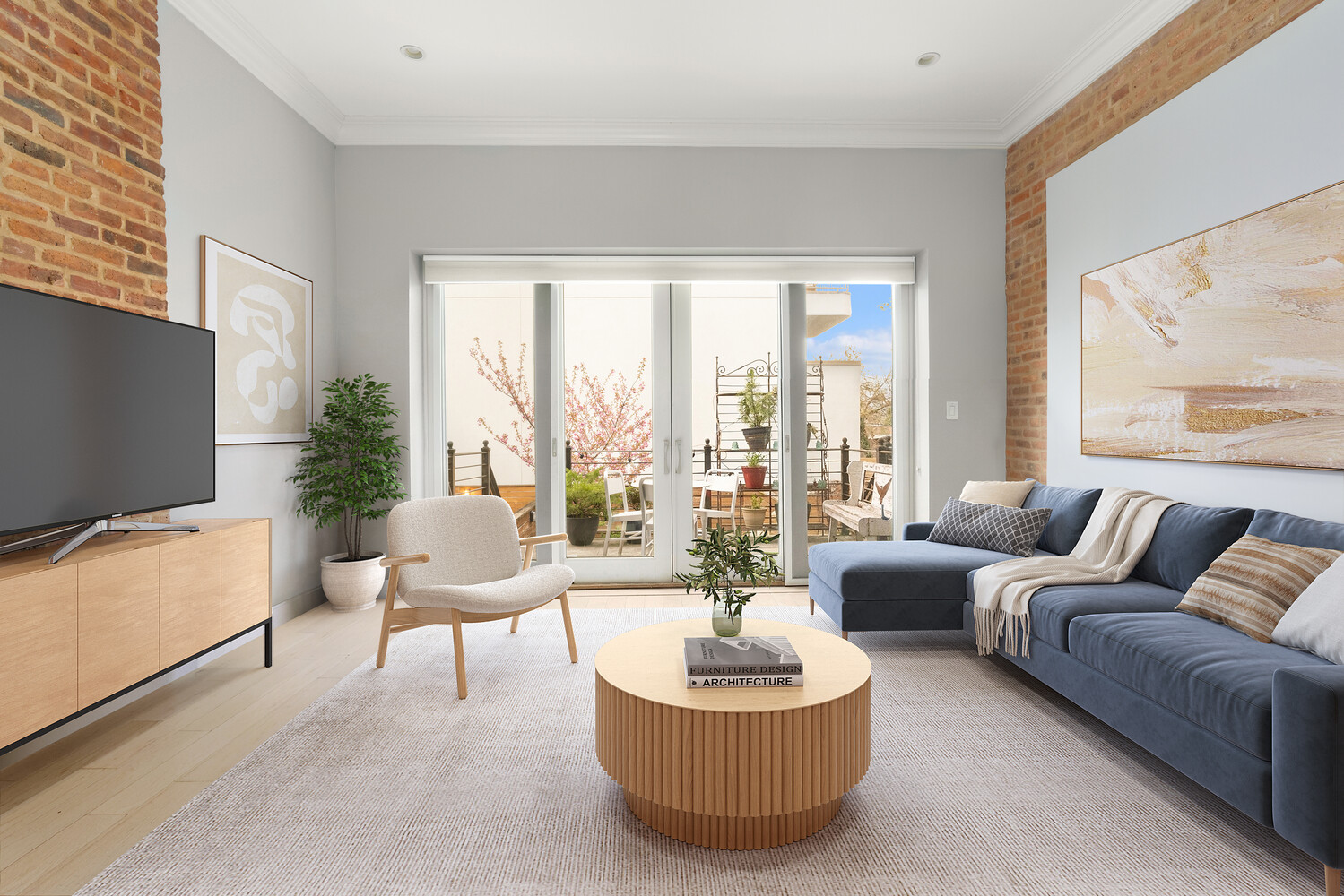 The triplex begins on the parlor floor and presents a classic layout reimagined with an open, modern flow. A spacious kitchen serves as the centerpiece, appointed with a large island, premium GE Monogram appliances, and custom cabinetry. This level also includes a dedicated dining area, a powder room, and a sunlit living space with sliding doors that open to an east-facing deck and a landscaped private backyard.