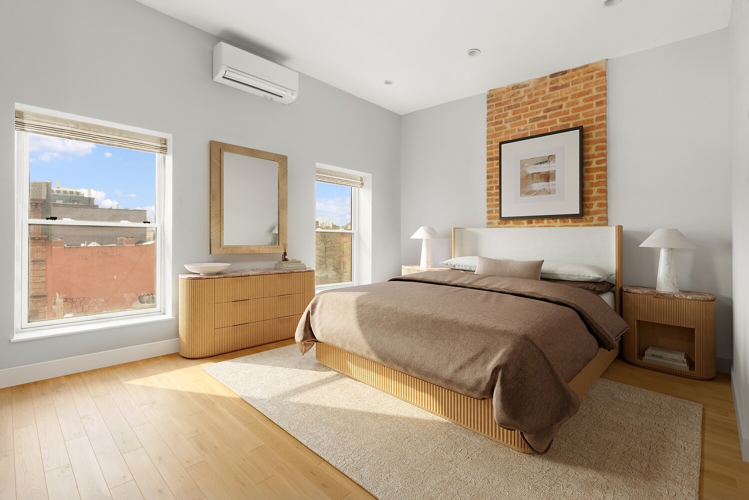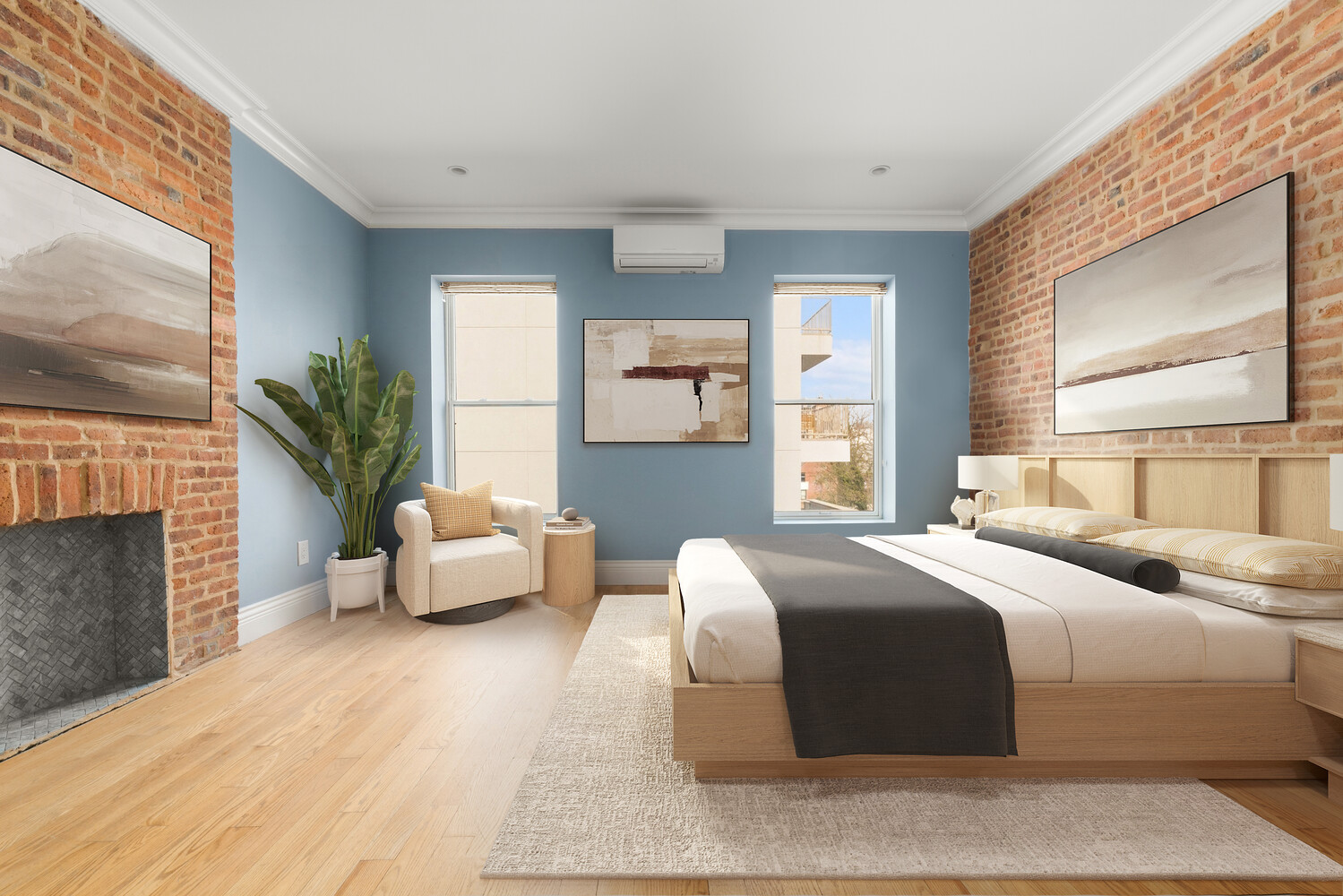 Throughout the home, refined finishes seamlessly blend historic character with contemporary design. Notable details include wide-plank flooring, high ceilings, exposed brick, decorative fireplace mantels, and carefully restored original elements. A central HVAC system with an efficient split configuration ensures year-round comfort.