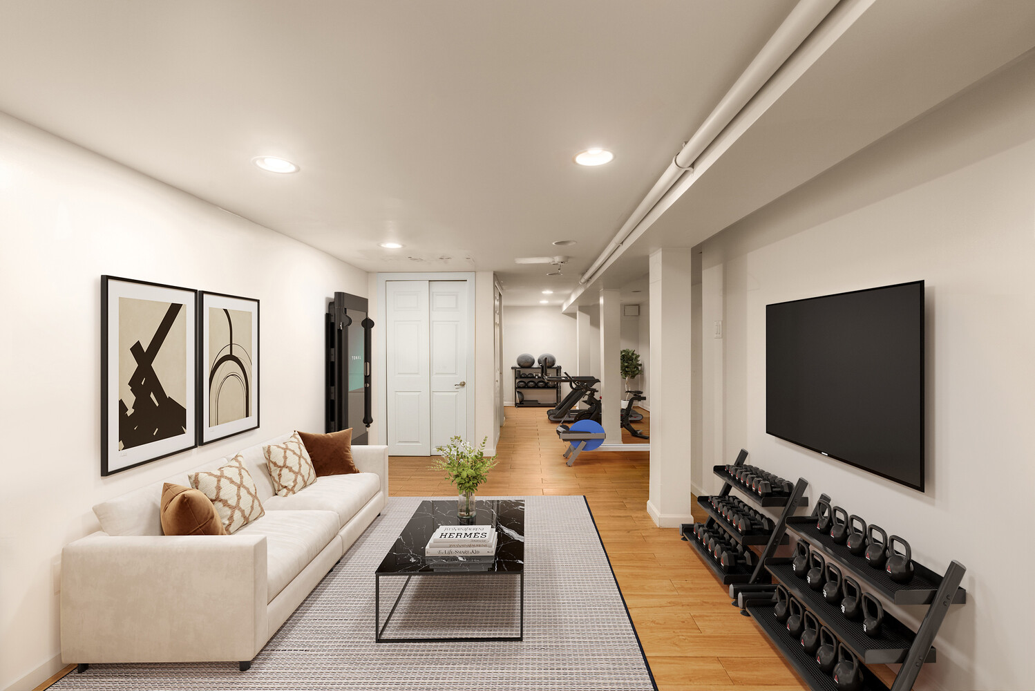 The garden-level unit offers flexibility for rental income or can be incorporated into the main residence to create a single-family home. The finished cellar provides additional versatile space, ideal for recreation, fitness, or storage.
