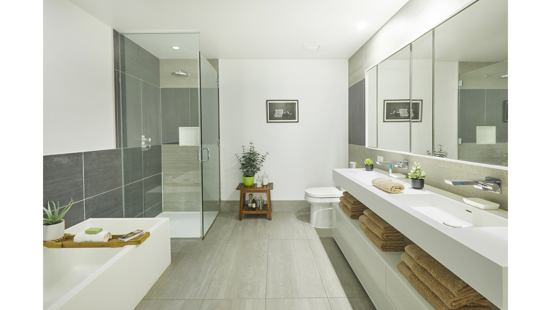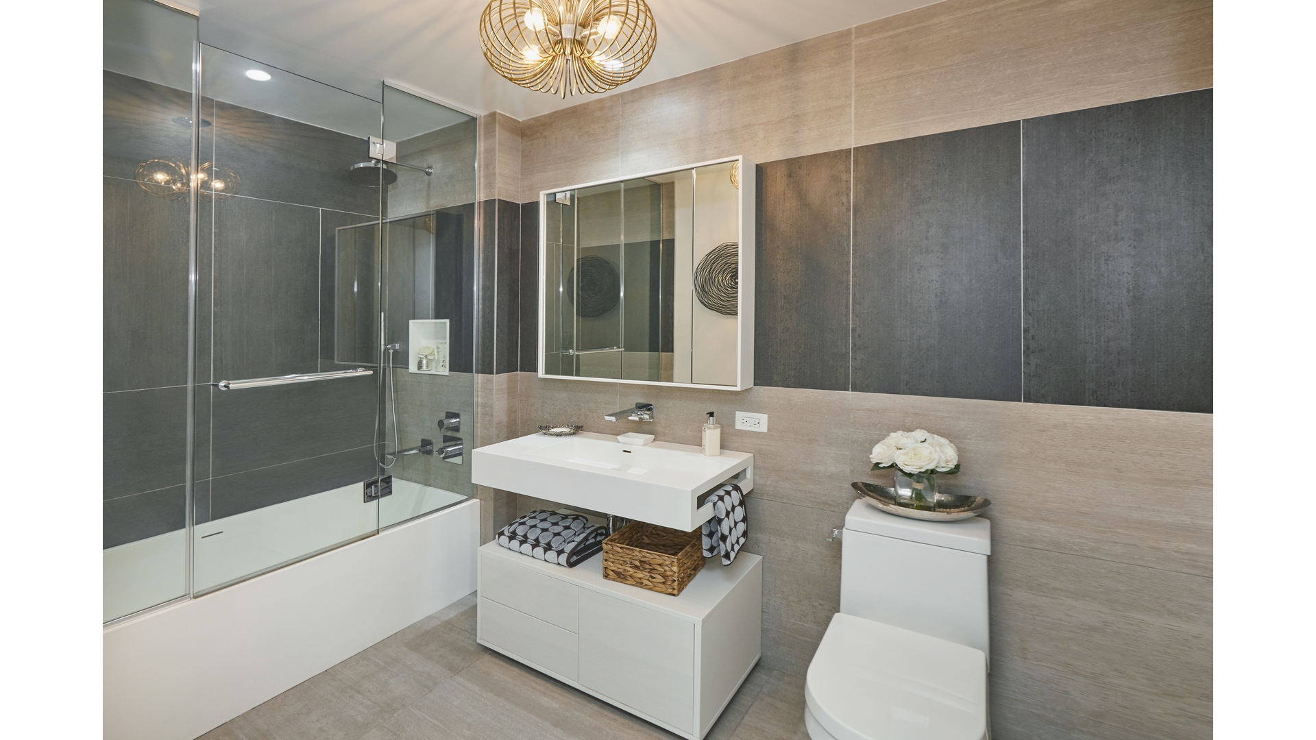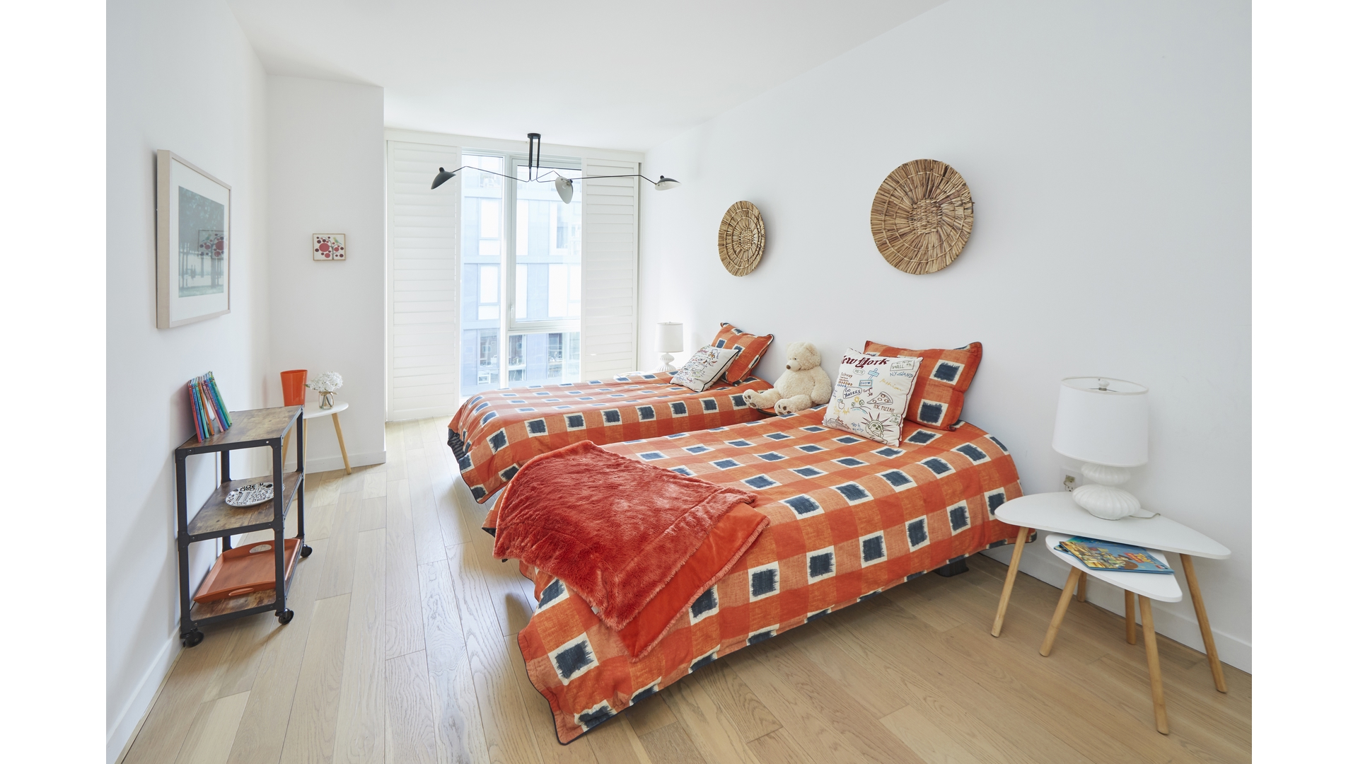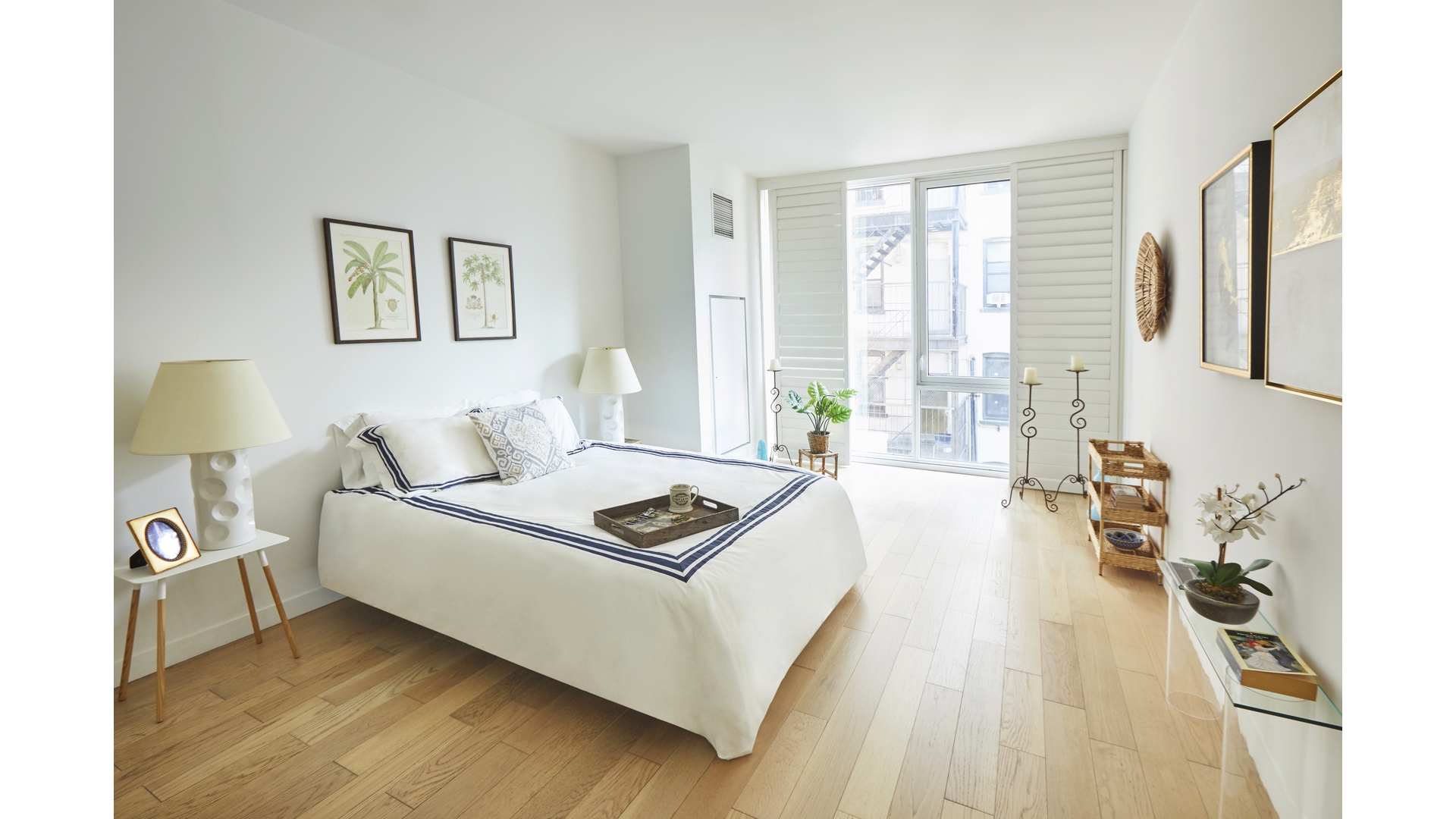 Enjoy the serenity of a tranquil, south-facing home nestled on a high floor, looking into the building's furnished, planted courtyard, and offering a consistent flood of natural light through the grand floor-to-ceiling windows outfitted with custom Somfy blinds. The open layout seamlessly integrates the contemporary kitchen into the living area, creating an ideal space for entertainment. The sleek white open island kitchen features a Silverstone quartz counter top, imported Italian cabinetry, Bertazzoni gas range and oven, integrated ultra quiet dishwasher and integrated Liebherr refrigerator. The bedrooms are thoughtfully arranged on opposite ends of the apartment, ensuring privacy. The primary bathroom is equipped with a dual sink vanity, and is conveniently located en-suite, and has a heated floor. Additional home features include beautiful hardwood floors and an in-unit washer and dryer.