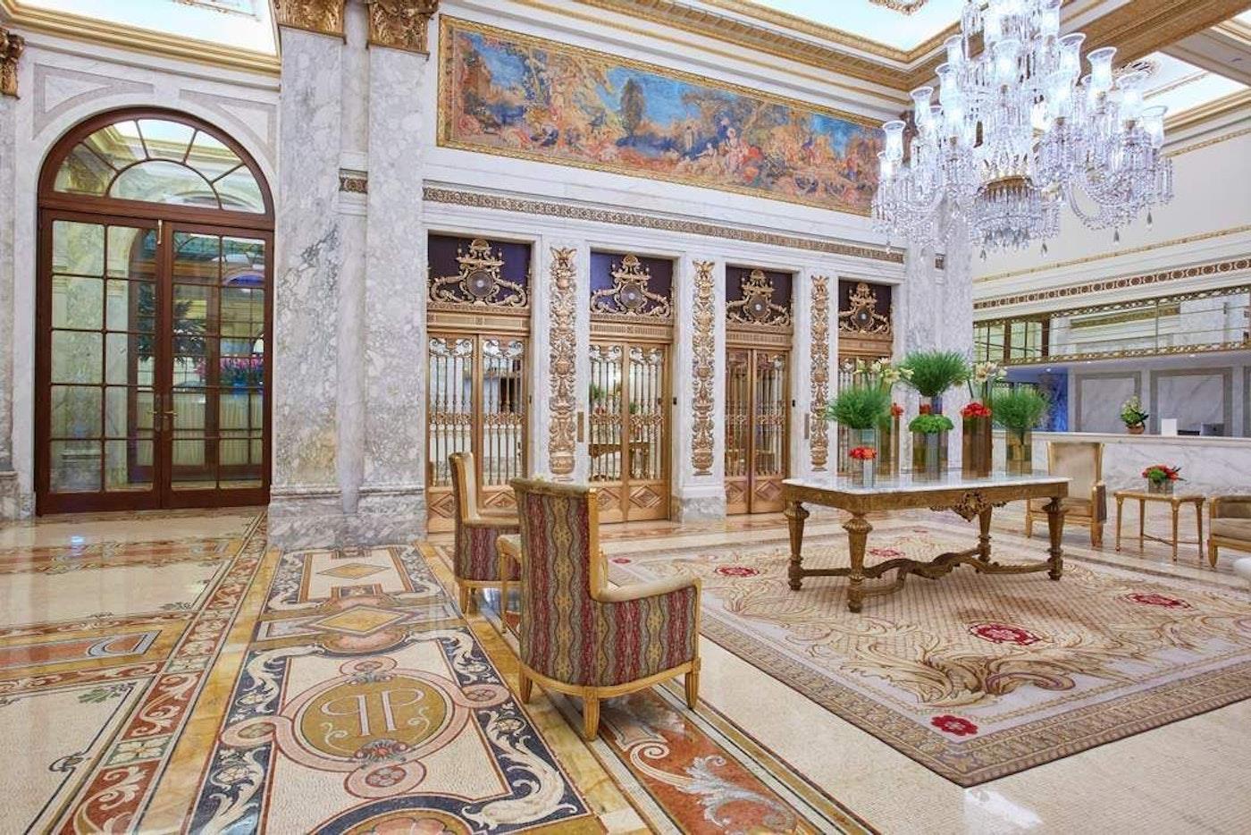 Double glass doors lead from the lobby of the Private Residences to The Palm Court, Champagne Bar, and Rose Club, and the Plaza Shops.