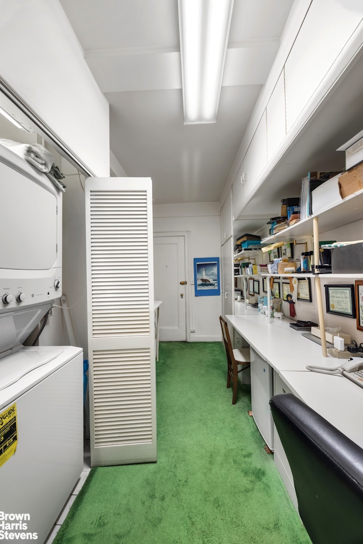 Bathed in natural sunlight from large south-facing windows, the spacious living room offers tranquil treetop views and is adorned with timeless pre-war details, including beautiful hardwood floors, a decorative fireplace, plentiful built-in bookshelves and high ceilings. A separate office on the same floor provides the ideal space for working from home or can easily be transformed into a guest area or reading room. It currently has a washer/dryer.