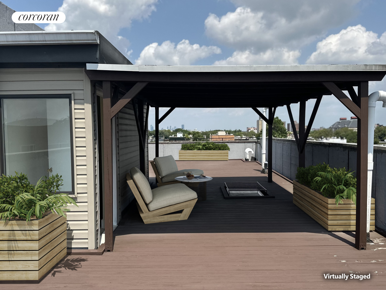 Located on the upper two floors of a handsome brick building on tree-lined Macdougal Street in Bed-Stuy Brooklyn, 84 Macdougal Street Apt. 2 is an astonishing 2,236 square foot duplex condo with a flexible layout. From the common lobby, ascend the staircase to Apt. 2 and you will encounter the vast first floor of the duplex, a 1,096 sf space including a massive open kitchen/dining room with its own balcony and a deluxe pantry with wet sink that will satisfy all of your cooking and entertaining needs. The floor's hallway has two additional closets, a full bathroom and a large living room, also with its own balcony. The upper floor of the duplex has another tremendous floor plate with two huge bedrooms, two large full bathrooms, laundry and an interior accessory room with skylight. One more flight leads to the rooftop with a pergola providing shade and wow views of four cityscapes: Downtown and Midtown Manhattan, Downtown Brooklyn and Long Island City.