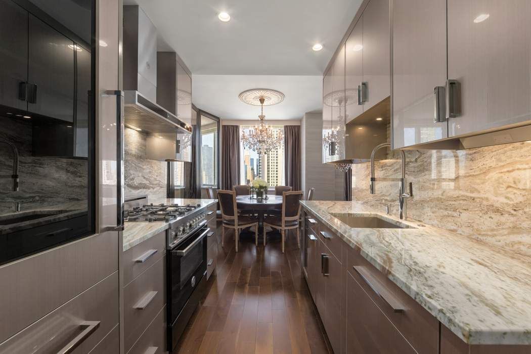 The expansive living and dining areas are perfect for entertaining, featuring a dramatic custom walnut wall unit, floor-to-ceiling paneling, and a stunning Rococo crystal chandelier. The chef’s kitchen is outfitted with top-of-the-line appliances, silver lacquer cabinetry, quartzite counters, and a wine fridge. The king-sized primary suite offers jaw-dropping views, a fully customized walk-in closet, and a spa-like marble bath with a deep soaking tub and multi-spray shower.