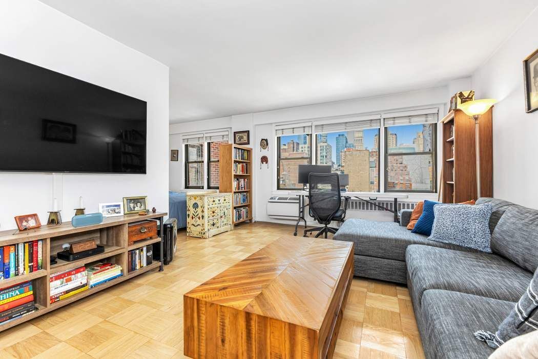 Perched on a high floor with rare, wide-open western views, this beautifully renovated alcove studio is a true standout — bathed in natural light all day and offering exceptional flexibility of space. The expansive layout includes a generous sleeping alcove that easily fits a queen-sized bed and can be enclosed to create a true Junior 1-bedroom. The open living area is framed by skyline views and features warm hardwood floors throughout as well as a through-the-wall air conditioner.