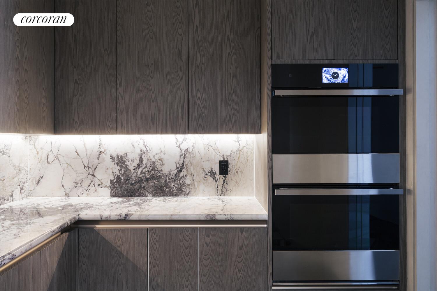 The kitchen, with millwork from Ornare, is centered below a massive skylight, and a twelve-and-a-half-foot island with seating for up to 6 creates the perfect environment to cook and entertain. A three-inch rounded Calcatta Paonazzo book-matched marble slab provides a modern element within the context of the space, and stone shelves with integrated lighting illuminate the show kitchen, along with double fridge and double columns freezers. Down the hall lies a "messy" kitchen with a pocket door with dual ovens, a warming drawer, and a wine cooler.