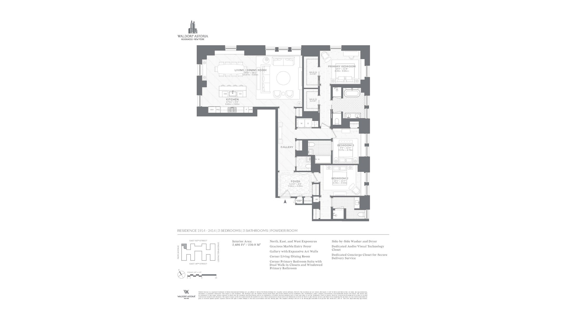 Own a piece of the legacy at Waldorf Astoria Residences New York. Residence 1914 is situated on the corner of 50th Street, facing north and west, and offers stunning views of Park Avenue. Designed by internationally acclaimed designer Jean-Louis Deniot, residences combine modern comfort with signature features such as a dedicated Concierge Closet and keyless entry with opulent details like ceiling coves, herringbone floors, oversized custom-paneled doors, spacious walk-in closets, and grand entry foyers with marble floors and brass inlays .