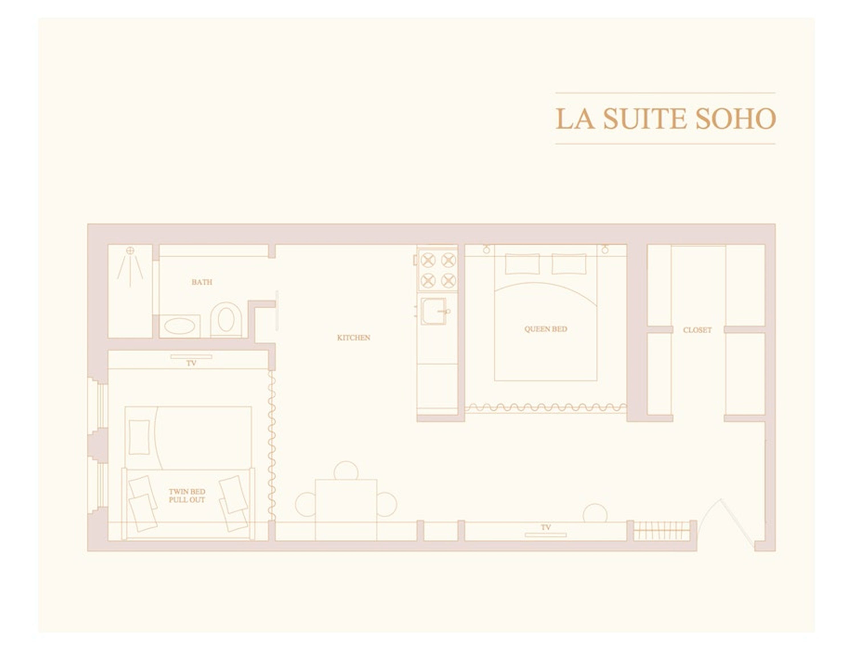 The sleeping alcove with a king bed is also adorned with a TV and large drawers for additional storage. The living area is adorned with a decorative fireplace centered in the room. Opposite there is a convertible queen sofa bed that can be converted into a