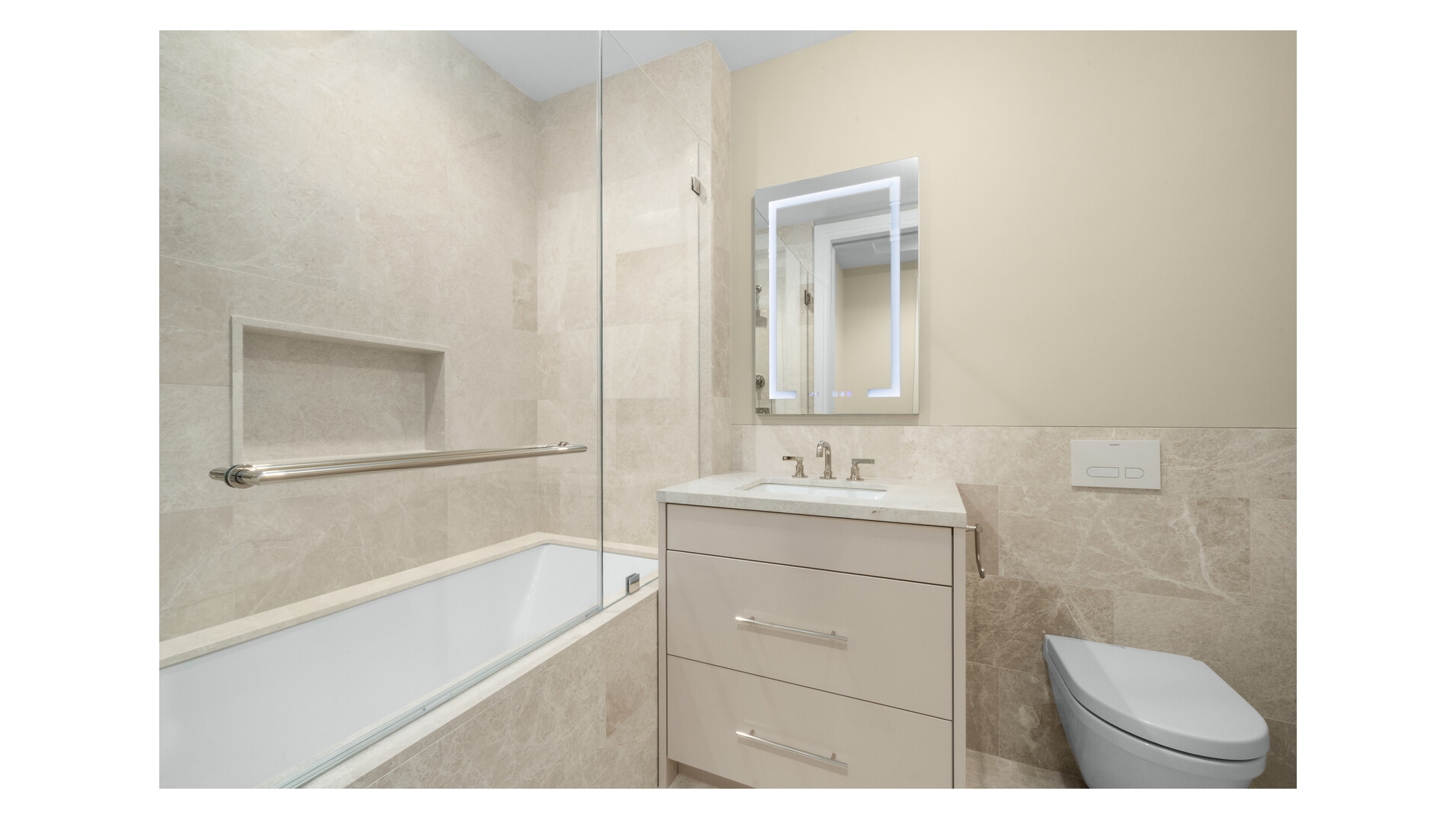 A separate powder room for guests showcases a striking backlit onyx stone vanity. The residence also includes a private laundry room with an LG washer and dryer. Comfort is ensured year-round with central air conditioning, individual climate zones in each room, and a high-performance, dedicated VRF HVAC system. Solid white oak floors with a custom stain run throughout the home.