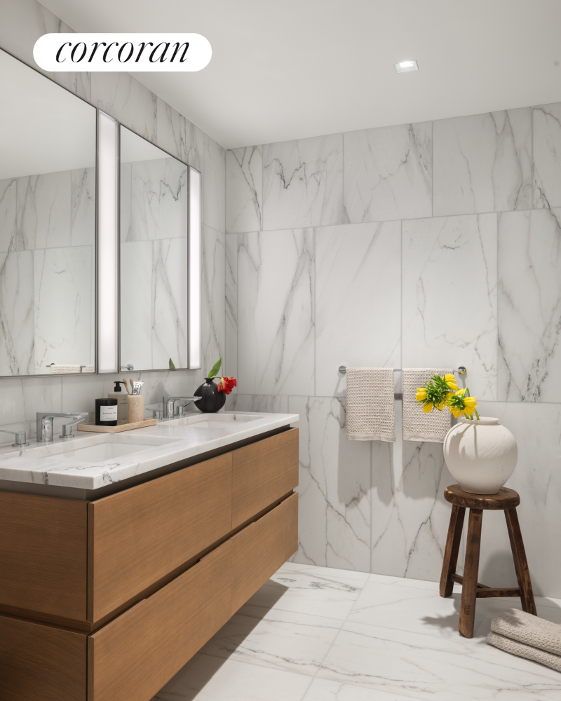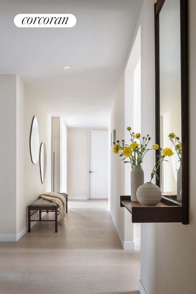 The meticulously-detailed interiors include myriad modern details including 7-inch-wide plank white oak flooring and massive bronze-finished windows with Caesarstone window ledges. Open-concept kitchens feature Miele appliances, natural warm-toned quartzite countertops, crisp matte white lacquer cabinetry, architectural cove lighting and Dornbracht faucet fixtures. Bathrooms are clad in handsome honey-toned European White Oak cabinetry, Calacatta Lincoln marble countertops with undermounted sinks, and showers with Dornbracht fixtures.