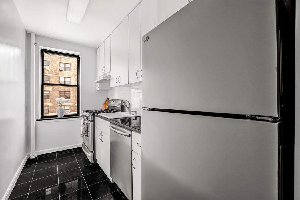 A windowed kitchen and bath create a thoughtful separation, buffering the oversized bedroom from the home's main living spaces. Five deep closets provide ample storage, while bicycle storage and a laundry room are available in the well-maintained basement. The intimate and pet-friendly building, with just under 30 residences, is impeccably cared for by a live-in superintendent who also assists with packages and security via the video intercom.