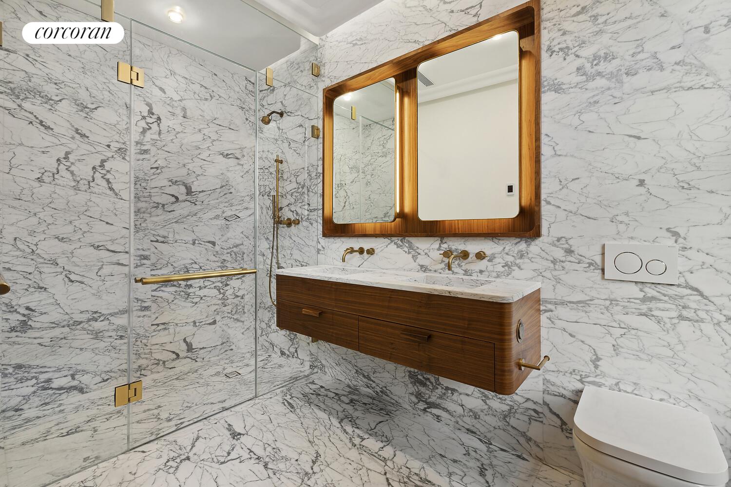 The lower level features a private bedroom suite with a separate street entrance, full-service pantry with appliances, large closet, and en-suite bath. This is a perfect space for when friends and family visit. There is a spacious den with a gas fireplace and a Stattuario white marble wet bar with Miele fridge and wine cooler. The marble detail is continued throughout the home. The floor also has a spacious gym with a glass ceiling illuminating the space. There is also a laundry room, powder room, and a mechanical room all cleverly tucked away. To top it off, there are radian heated floors on this level.